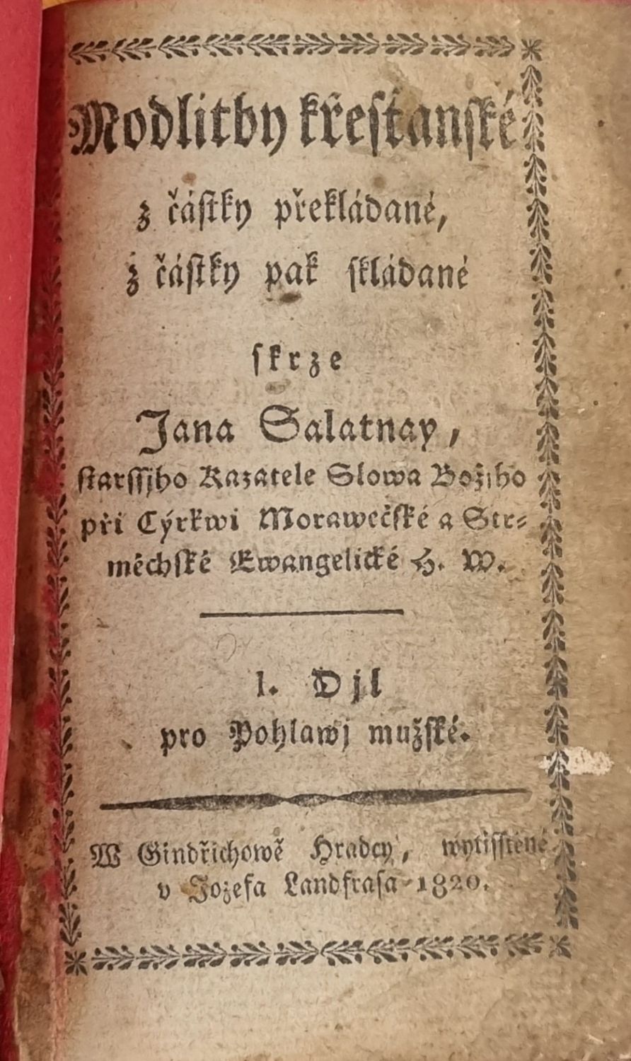 Gotika, signatury, stránkové kustody, živá záhlaví od sazby oddělená jednoduchou linkou. Titulní list olemovaný rámečkem rostlinného charakteru, ozdobné tyče, tučně tištěné plné iniciály. <br>Dobová kožená vazba s tlačeným rámem na obou deskách, uvnitř rámu na položené knize stojící kalich, ve hřbetu jednotlivá pole oddělená jednoduchou zlacenou linkou, v jednotlivých polích tlačené ozdůbky z ornamentů, červeně barvené ořízky. Vazba lehce ohmataná a místy mírně odřená, titulní list a několik dalších listů zahnědlých. <br>Jan Salatnay (28.10. 1758 Miškovec - 19.10. 1827 Moraveč), celým jménem Ján II. Szalatnay de Nagy Szalatna nebo též Ján II. Slanický ze Zvolenské Slatiny - byl významnou osobností evangelického sboru v Čechách a na Moravě. Jako kazatel působil v Moravči u Pelhřimova, kde také založil církevní školu. Je považován za zakladatele evangelického sboru na Moravě. Druhý svazek nabízené knihy, pro pohlaví ženské, vyšel o rok později.