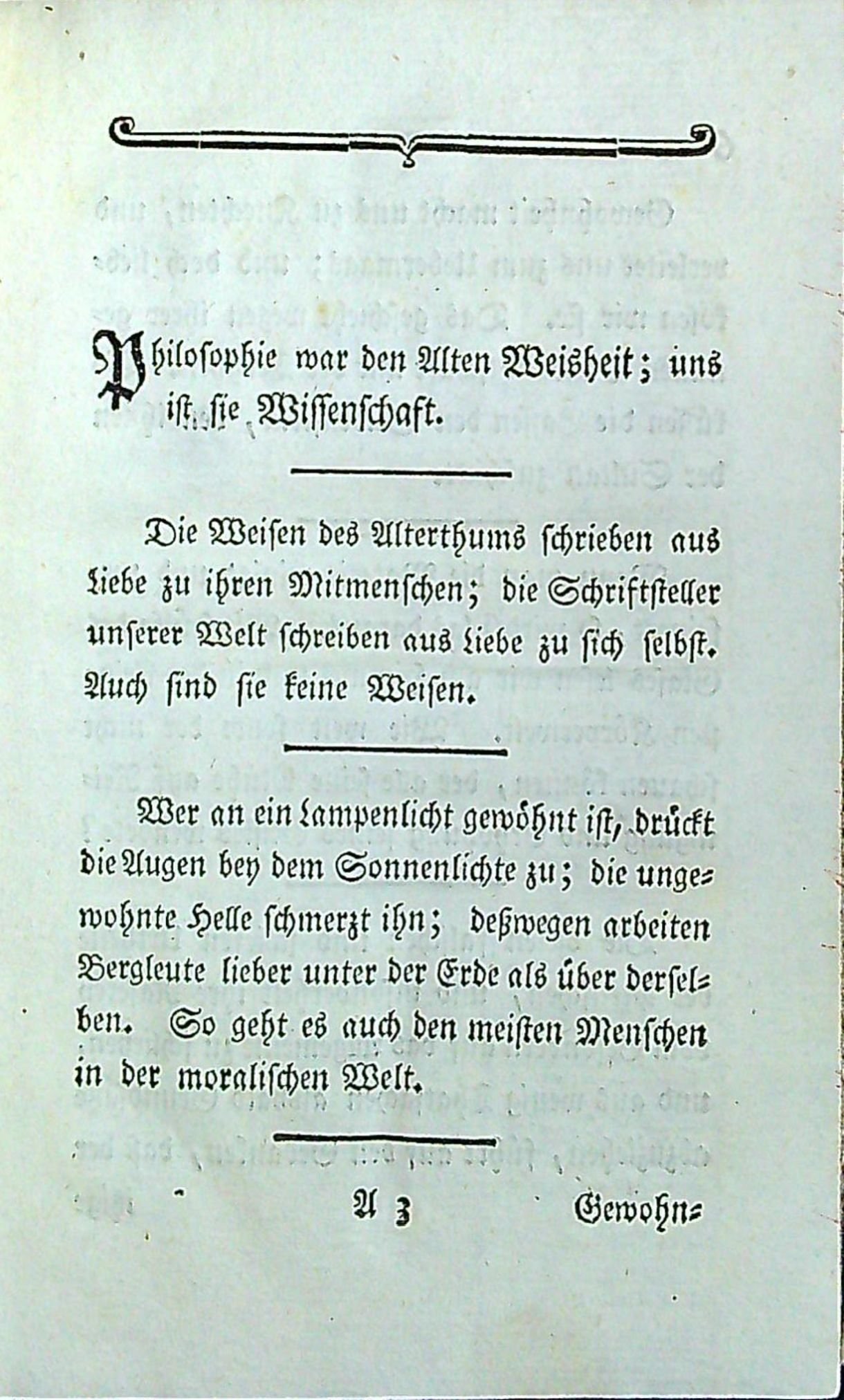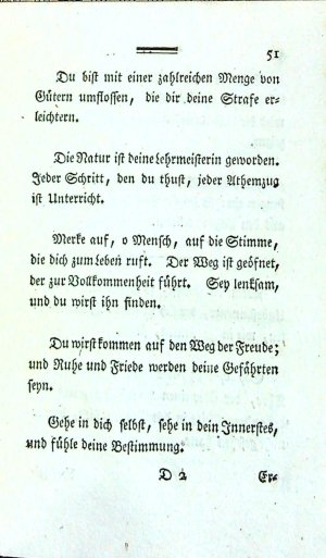 Tištěno švabachem, uprostřed horního okraje stran dvojitá mizící linka,, mizící jednoduché a zvlněné linky, koncová viněta. Na nečíslované straně 45 mezititul "Zugabe oder Anhang zum Taschenbuch für Freymäurer" a na listu následujícím "Zugabe aus der höhern Philosophie zum Nachdenken". Tištěno na ručním rýhovaném papíře.
