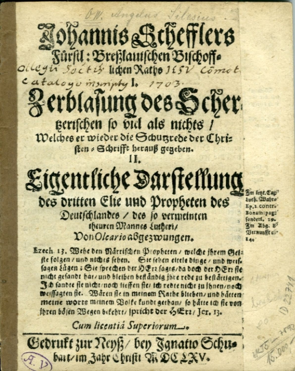 Worldcat Catalogue eviduje pouze 2 exempláře v německých knihovnách (Mnichov a Wolfenbüttel).<br>Živá záhlaví, tištěné poznámky po stranách, pásové vlysy a lišty, iniciály ve výši 3-5 řádků, na straně 45 viněta se sv. Jiřím na koni zápasícím s drakem v rozevřeném věnci, koncová vinětka. <br>Bez vazby, na zadní straně jako obálka přilepený papír z počátku 20. století. Titulní list je při vnějším okraji v šíři cca 25 mm ustřižený, okraje stran 5-6,13-14,31-30,45-46,53-54 jsou ustřižené při spodním okraji cca v 15 mm (po signaturu a stránkový kustod). Na tit. listu provenienční přípis jesuitské koleje v "Comot" (ustřiženo), pravděpodobně v Chomutově, při spodním okraji vlevo dole vlastnické razítko A.V.<br>Johann Scheffler (1624-1677 Vratislav), známější pod svým pseudonymem Angelus Silesius, slezský, německy píšící barokní básník, lékař a teolog. Jeho otec byl polským luteránským šlechticem, Johann roku 1653 konvertoval ke katolictví, vstoupil do Řádu menších bratří, po konverzi přijal jméno Angelus a přídomek Silesius. Jeho nejznámějším dílem je "Poutník cherubínský".