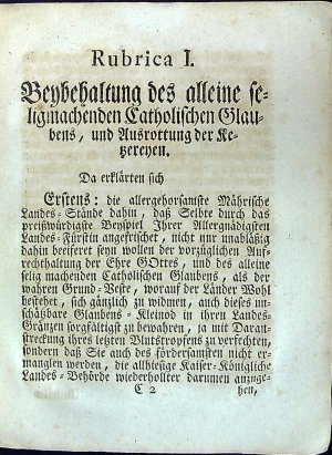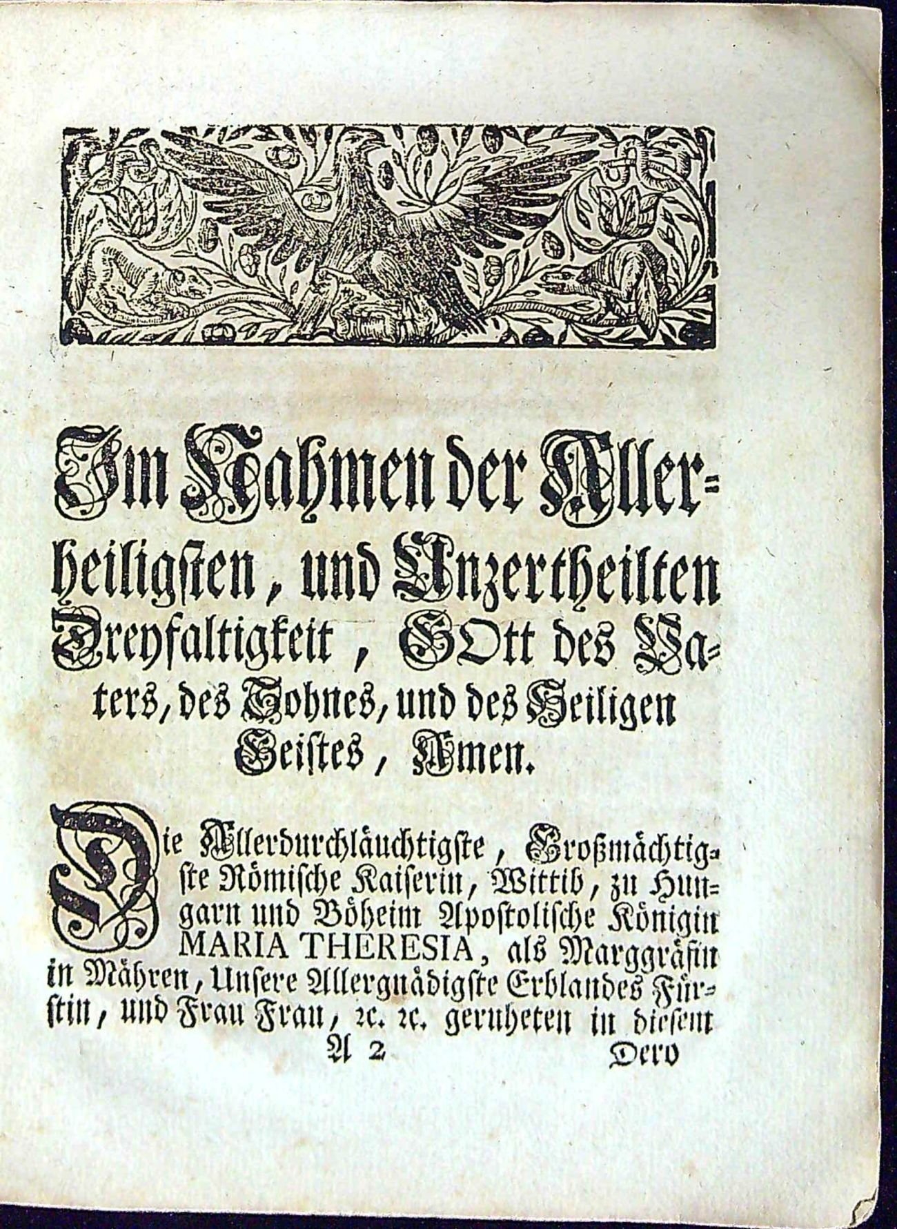 Tištěno švabachem, latinská slova antikvou. Na titulním listu mědiryt. erb se symboly Zemí Koruny české, na rubu erb Moravského markrabství, na líci posledního listu erb editora Heinricha Xavera Hayecka von Waldstätten a na rubu erb Josepha Franze von Pillersdorf. Vstupní mědirytinový vlys, plná iniciála propletená úponky zalomená do výše 4 řádků.