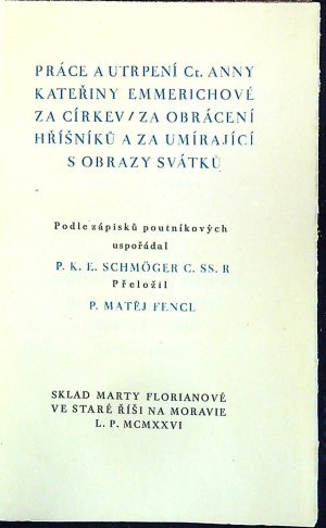 Práce a utrpení Ct. Anny Kateřiny Emmerichové za církev / za obrácení hříšníků a za umírající s obrazy svátků. Podle zápisků poutníkových uspořádal ... Přeložil P. Matěj Fencl.