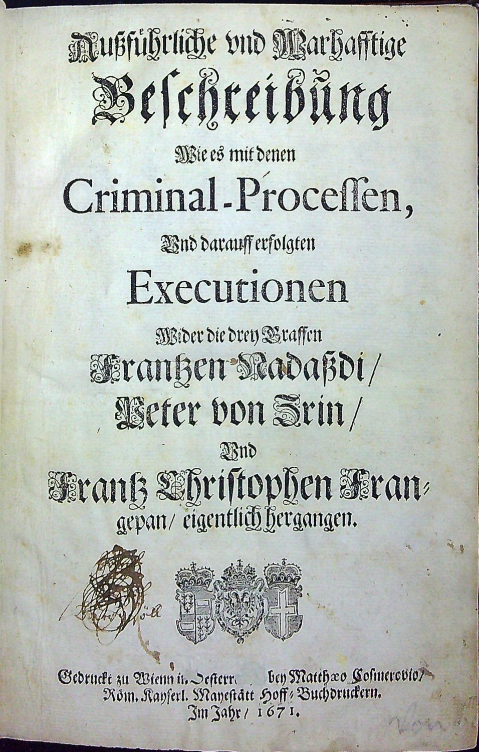 Aussführliche vnd Warhafftige Beschreibung Wie es mit denen Criminal-Processen, Vnd darauff erfolgten Executionen Wider die drey Graffen Frantzen Nadassdi/ Peter von Zrin/ Vnd Frantz Christophen Franzgepan/ eigentlich hergangen.