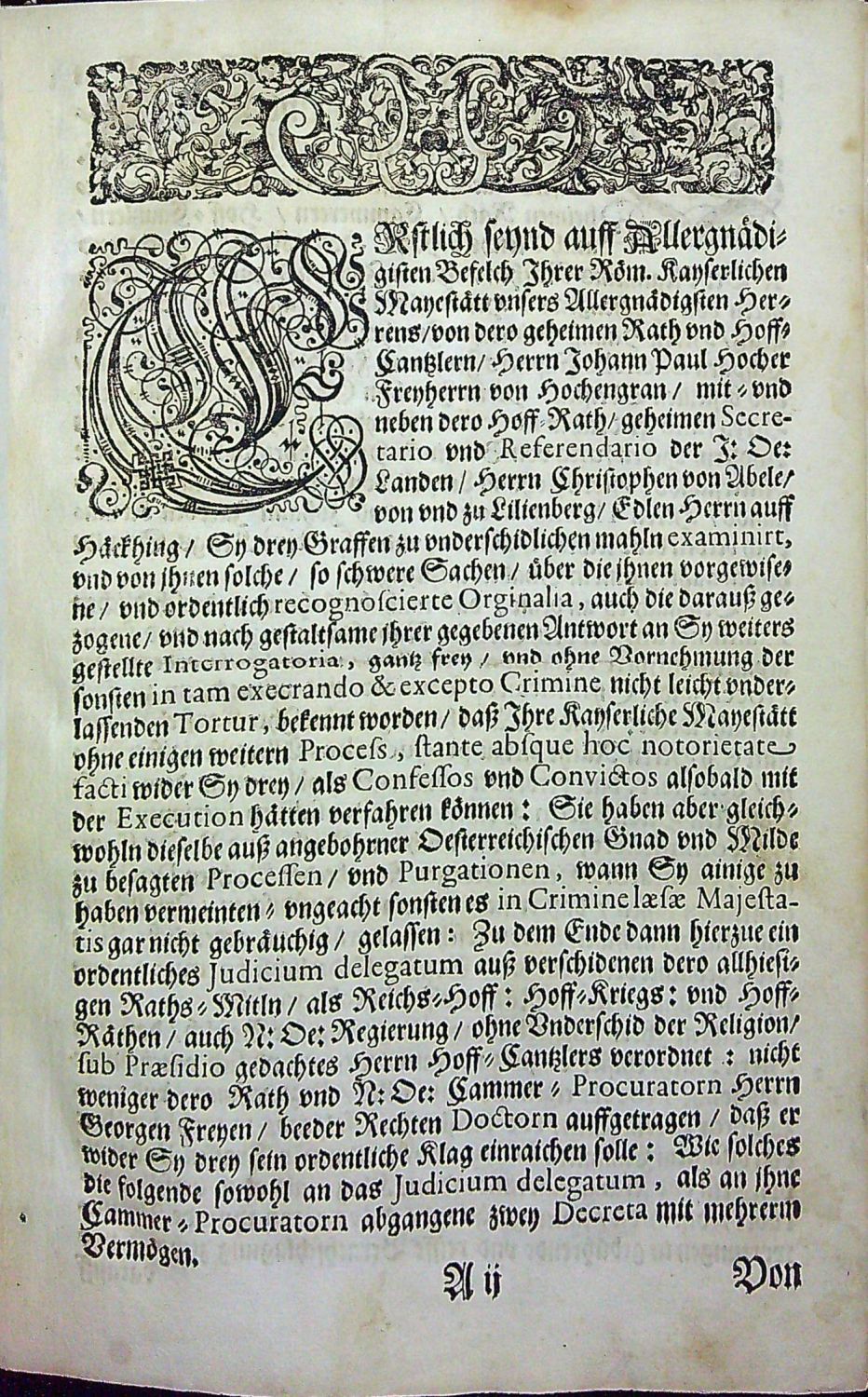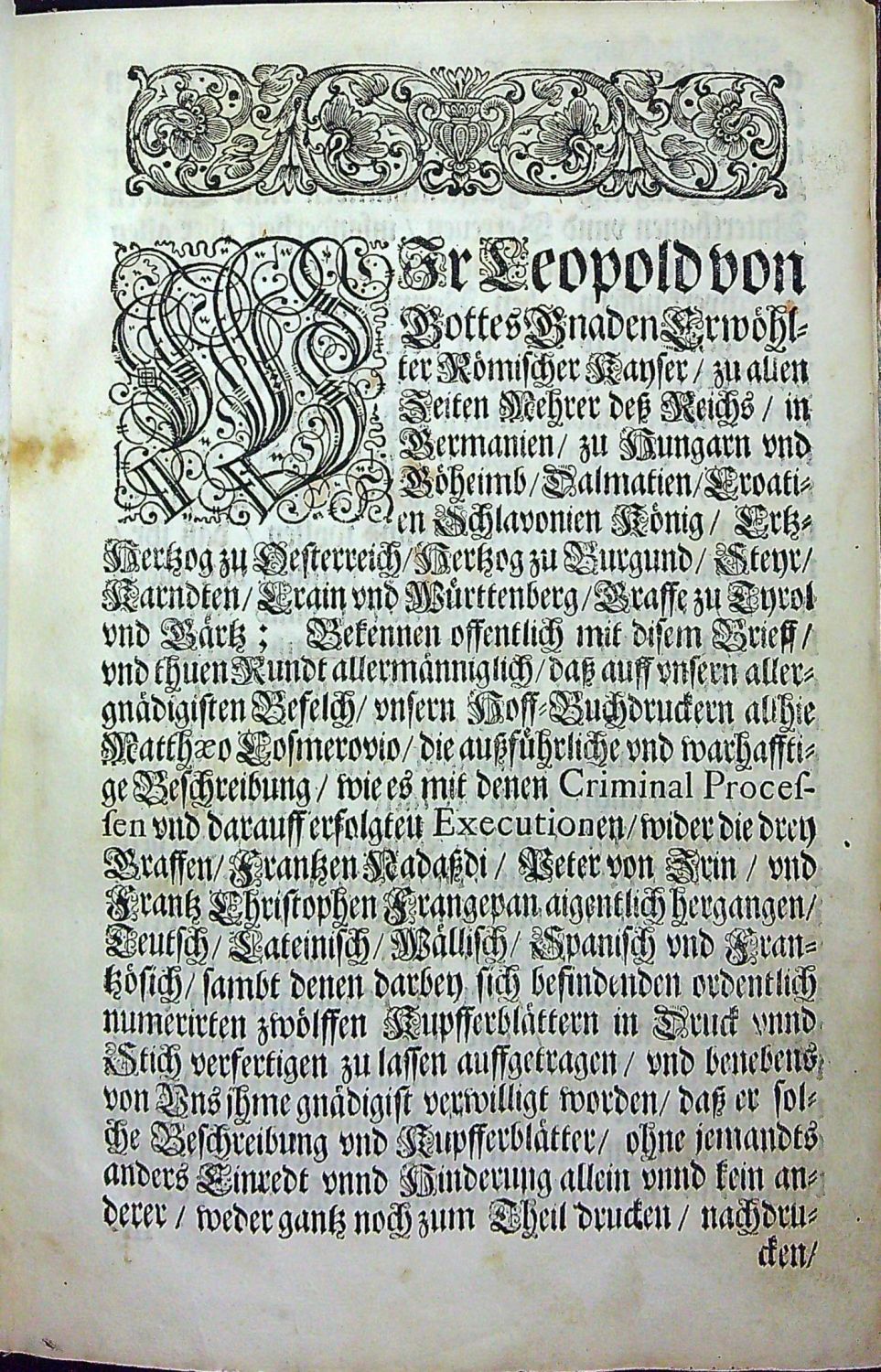 Tištěno švabachem, latinská slova antikvou, konturové iniciály propletené úponky zalomené do výše 7-10 řádků, plné iniciály propletené úponky zalomené do výše 4-7 řádků, pásové vlysy. Na prvých 28 nepaginovaných listech text, na dalších 12 listech text k rytinám.<br>+ přívazek: "Aussführliche vnd warhaffte Beschreibung Wie es mit dem Criminal-Process Vnd der darauff zu Grätz den I. December 1671. erfolgten EXECUTION Wider Johann Erasam von Tätenpach/ Eigentlich Hergangen". Wienn, Mattheo Cosmerovio, 1672, 13 listů. Tištěno švabachem, latinská slova antikvou, na tit. listu tištěné erby, vstupní konturová iniciály propletená rostlinnýmiu úponky zalomená do výše 7 řádků, plné iniciály propletené úponky zalomené do výše 5-7 řádků, pásové vlysy, viněta. <br>První dílo je popis procesu vedeného s Františkem III. Nádasdy, Petrem Zrinským a Františkem Kryštofem Frankopanem, organizátory spiknutí proti Habsburkům.