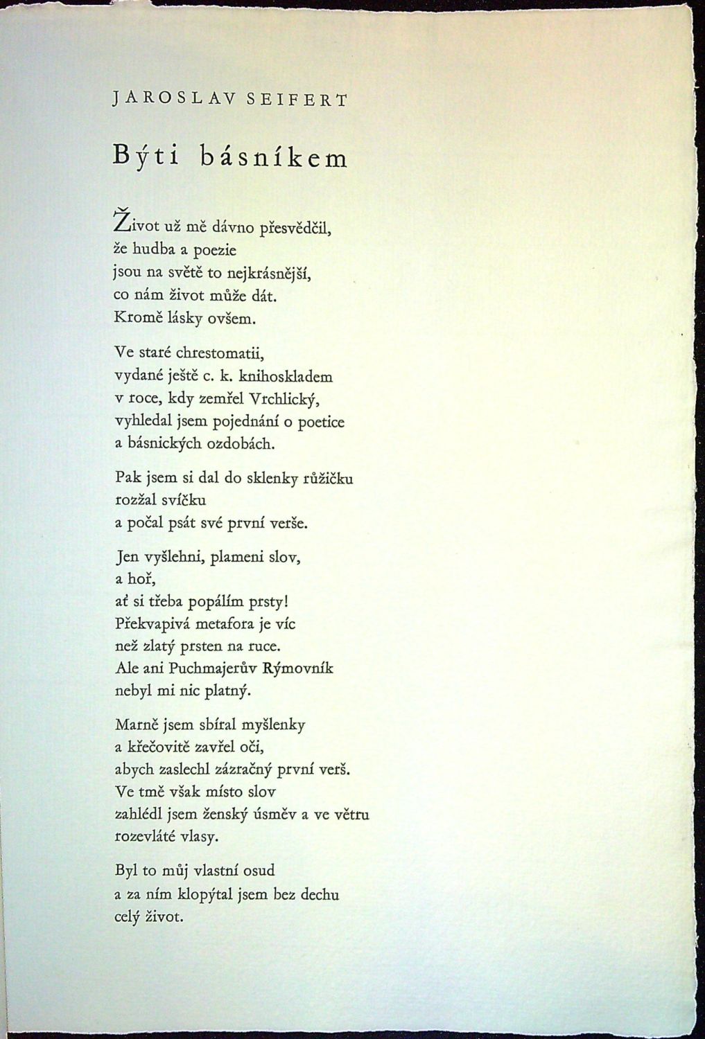Tištěno na ručním papíře jako pamětní tisk k poctě osmdesátin Jaroslava Seiferta a Cyrila Boudy pro účastníky valného shromáždění Spolku českých bibliofilů v PNP v Praze 11. dubna 1981. Na rubu předního listu výše zmíněný údaj, pod ním modrým perem podpis Seifertův, na líci druhého listu Seifertova báseň, suchá jehla Boudova volně vložena.