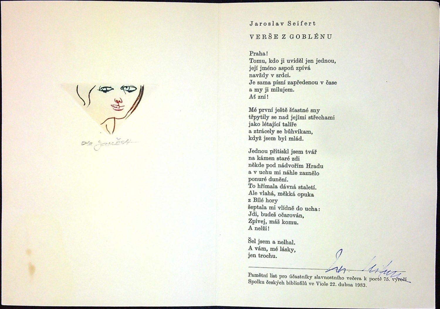 Na rubu prvého listu Janečkův lept, na líci druhého Seifertova báseň v závěru autorem modrým perem podepsaná. K poctě 75. výročí založení vydal jako pamětní list Spolek českých bibliofilů.