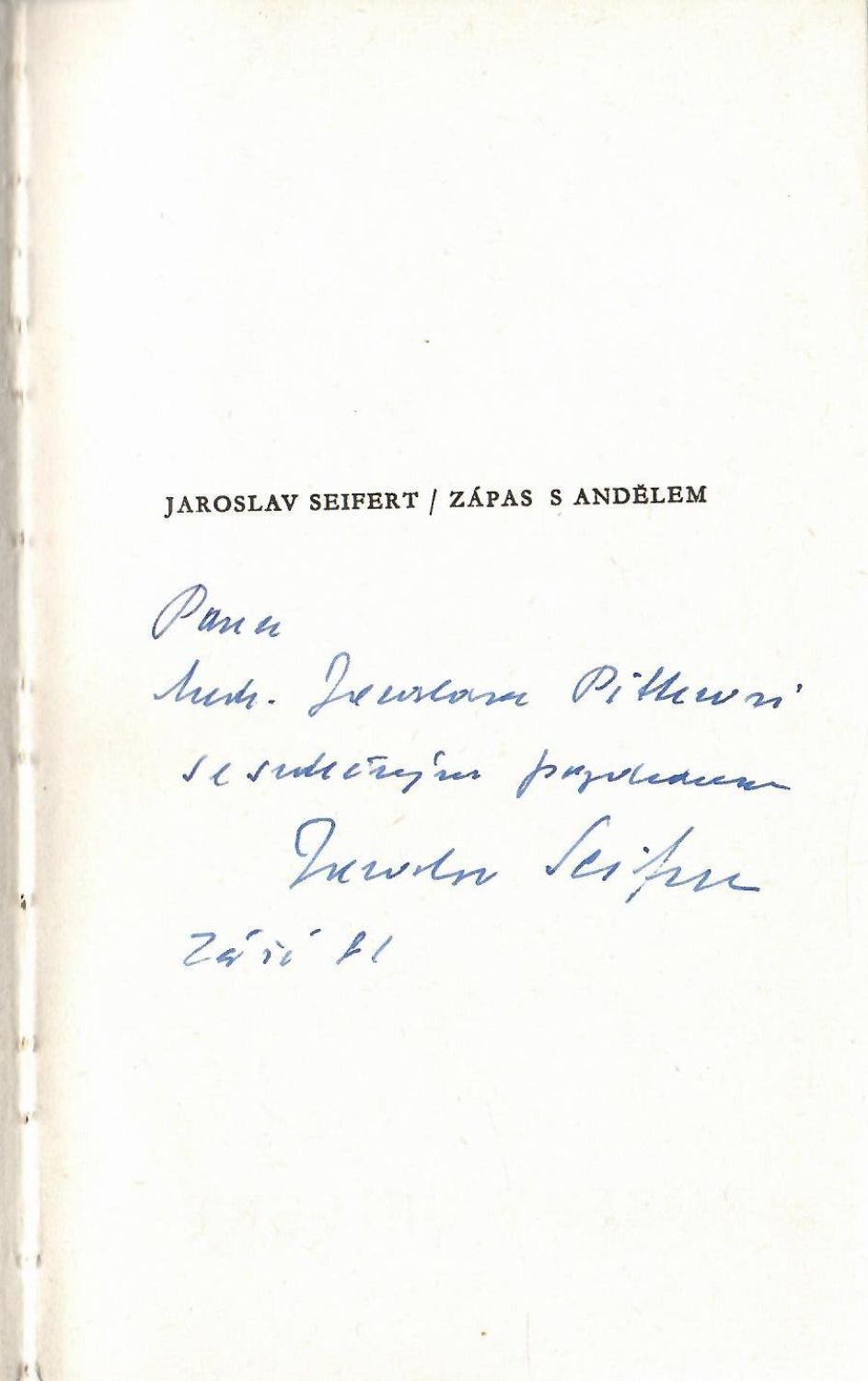 V knize rukopisná dedikace Jaroslava Seiferta. Papírový obal knihy lehce ošoupaný, na zadní desce drobné hnědé skvrnky.