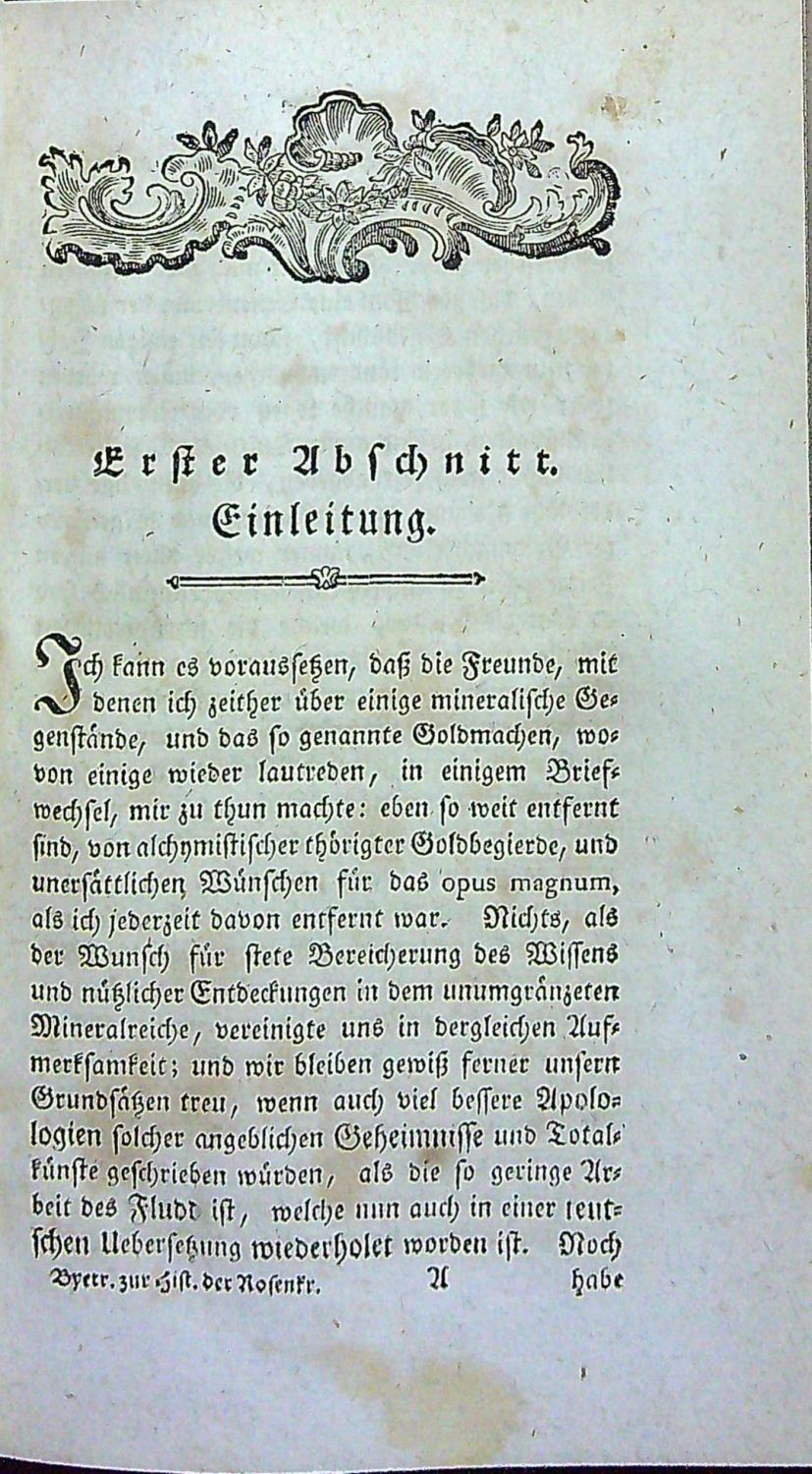 Německý text švabachem, latinský antikvou. Místy sazba ve dvou sloupcích, tištěné poznámky pod čarou. Uprostřed horního okraje stran mizící dvojitá linka, tučně tištěné plné iniciály ve výši 2 řádků, vstupní pásový vlys, na konci mizící ozdobná tyč.<br>Kartonová vazba z konce 19. století, přes horní i spodní okraj hřbetu přelepeny staré pap. knih. štítky. Papír místy zahnědlý. Na tit. listu staré razítko stuttgartské zednářské lóže "Drei Cedernů.<br>Johann Salomo Semler (18.12. 1725 Saalfeld - 14.3. 1791 Halle) německý církevní historik a komentátor Bible, kritik církevních dogmatů, některými považovaný za otce německého racionalismu. Od roku 1752 profesor na universitě v Halle. V nabízeném díle autor doplňuje německý překlad knihy Roberta Fludda, ve které Fludd obhajoval hnutí Rosenkruciánů.