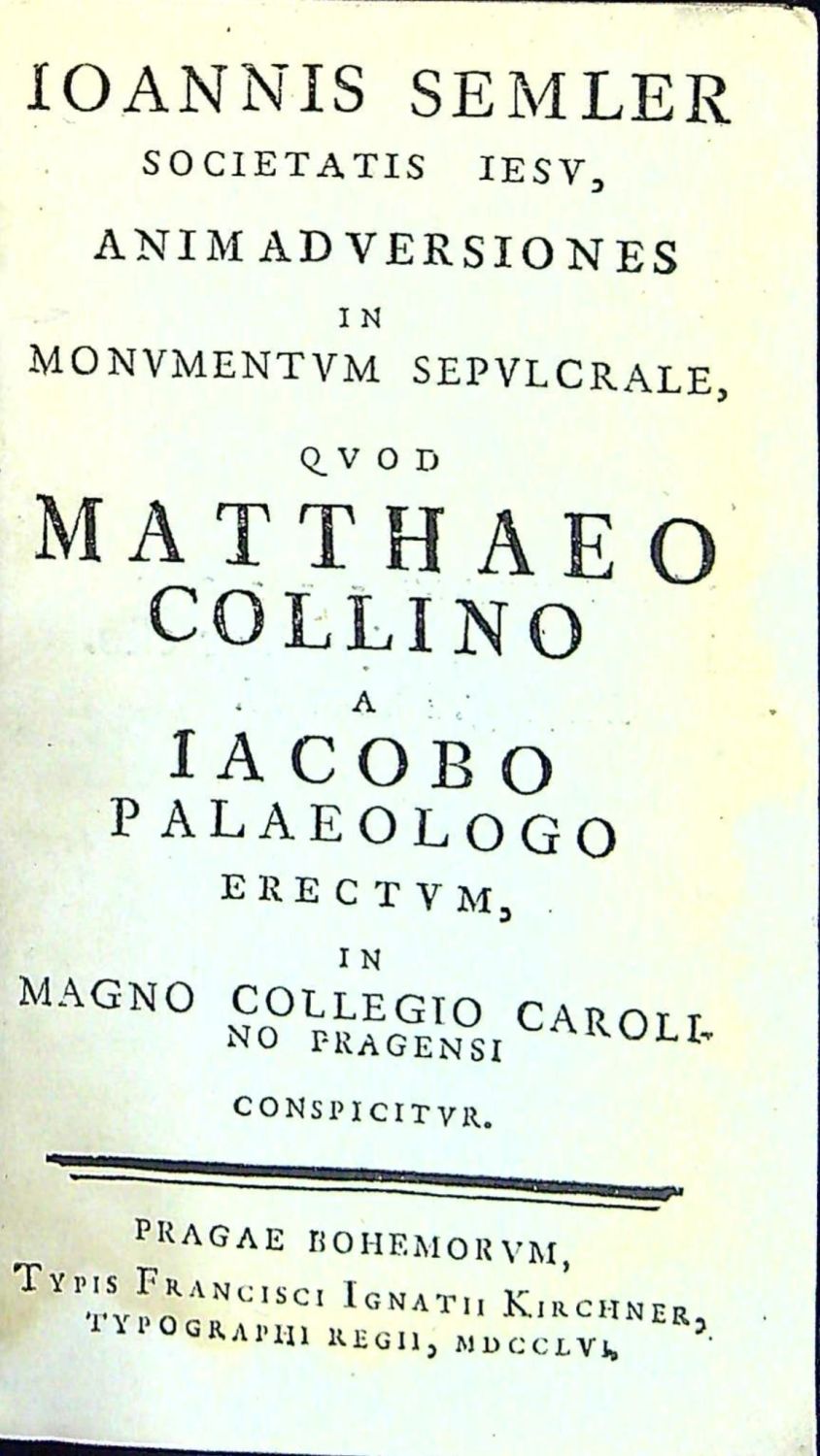IOANNIS SEMLER SOCIETATIS IESU, ANIMADVERSIONES IN MONVMENTVM SEPVLCRALE, QVOD MATTHEO COLLINO A IACOBO PALAEOLOGO ERECTVM, IN MAGNO COLLEGIO CAROLINO PRAGENSI CONSPICITVR.
