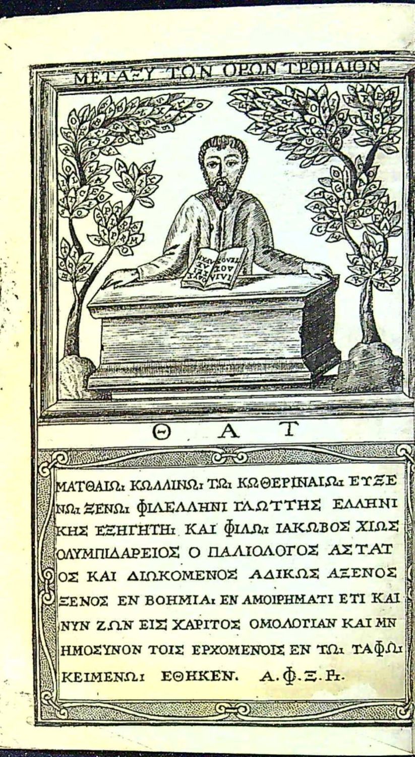 | Ilustrace: | Ve front. mědirytina v ozdobném rámu, v horní části muž sedící nad knihou za antickým náhrobkem, v části spodní rytý text alfabetou. |
