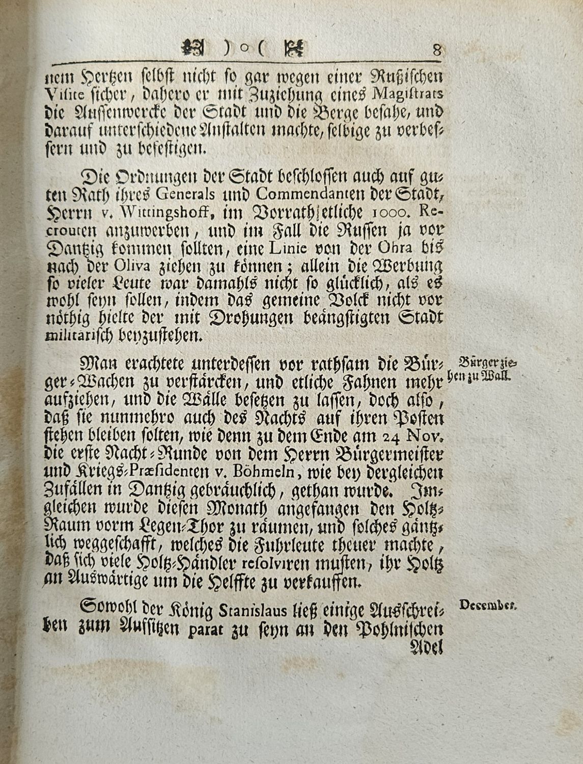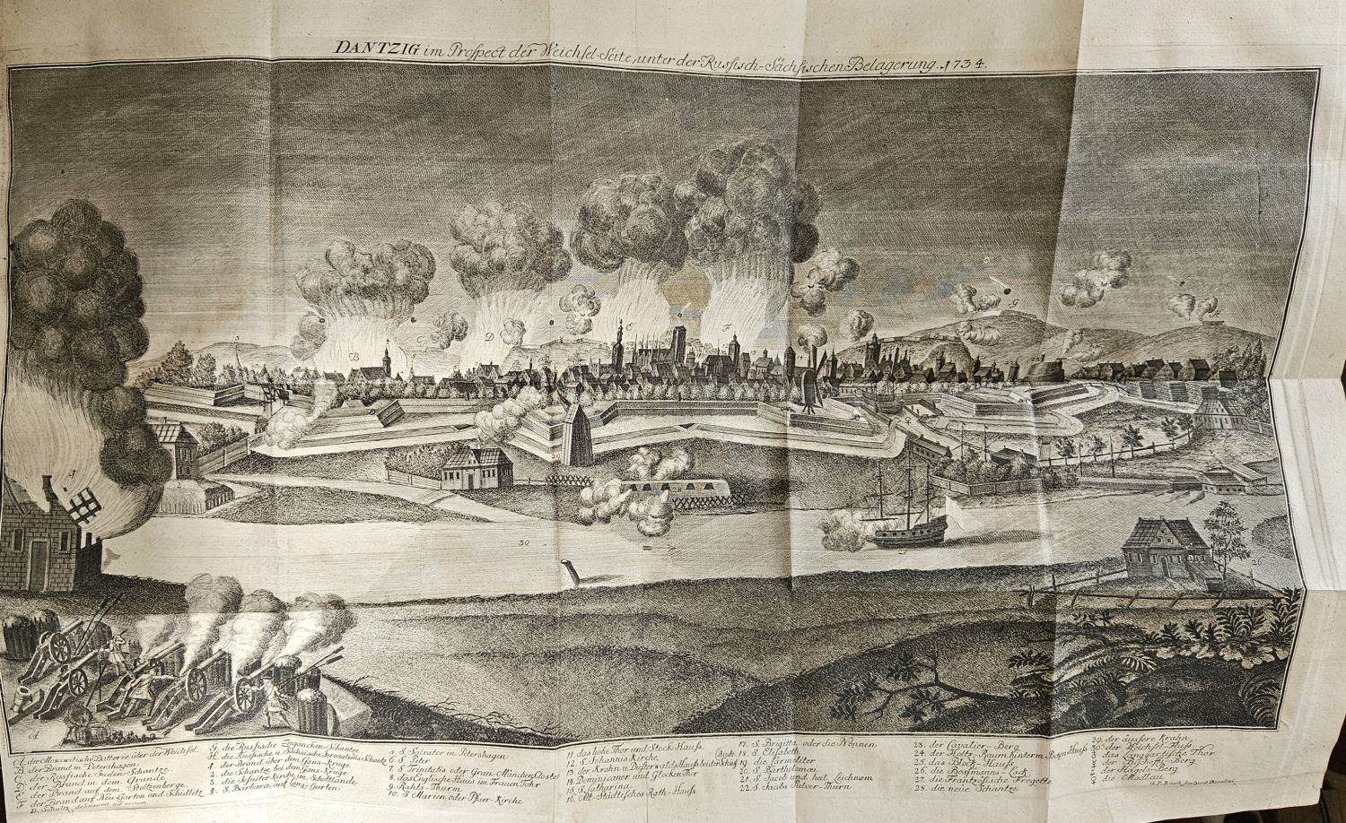 Tištěno švabachem, latinská slova antikvou, uprostřed horního okraje nula v obrácených kulatých závorkách mezi drobnými rostlinnými ozdůbkami od sazby oddělená jednoduchou linkou. Celkem sedm samostatných titulních listů, průběžná paginace, která však na sebe u jednotlivých dílů nenavazuje (viz rozpis stránkování). Plné iniciály propletené úponky zalomené do výše 2-7 řádků, pásové vlysy, viněty, tištěné poznámky po stranách. Druhý titulní list "Anhang Zu der accuraten und aufrichtigen Nachricht Von der Russisch= und Sächsischen Belager= und Bombardirung der Stadt Dantzig", třetí "Alt= und Neue Polnisch=Preussische Chronica .... Zweyter Theil", čtvrtý "Ordentliches Tage=Register Von denen Unternehmungen Derer Russen und Sachsen Bey der Belagerung Der Stadt Dantzig. Von unpartheyischer Feder entworffen", Cöln, Hans Paul Merian, 1737 (navazuje na díl předchozí), pátý "Thornische Begebenheiten, Welche Zu gleicher Zeit DANTZIGER Belagerung, 1733. und 1734. Sich merkwürdigst zugetragen. Von unpartheyischer Feder entworffen", Cöln, Hans Paul Merian, 1737, šestý "Elbingische Geschichte, Welche Zu gleicher Zeit Der DANTZIGER Belagerung 1734. Merkwürdigst sich zugetragen. Von unpartheyischer Feder entworffen", Cöln, Hans Paul Marian, 1737, sedmý "Anhang Des Kurtzen Auszuges Alter und Neuer Pohlnisch=Preussischen Kriegs=Geschichten, von Unpartheyischer Feder gesammlet", Cölln, Hans Paul Merian, 1740. <br>Ve front. mědirytina rytá C. Fritzschem dle D. Schulte, za stranou 142 rozkládací mědirytina (665 x 415 mm) s vyobrazením bombardovaného Gdaňsku signovaná Berolini (rytec) dle G. P. Busche, za str. 196 rozkládací mědirytina (330 x 190 mm) s vyobrazením mincí města Gdańsku, za str. 333 rozkládací rytina (210 x 225 mm) s vyobrazením pevnosti Weichselmünde v Gdaňsku, za str. 406 rozkládací rytina (250 x 215 mm) s vyobrazením kapitána Fischera a leutnanta Ringela, pozicemi ruských baterií a řekou Vislou, za str. 666 rozkládací tabulka s vyjmenovanými divisemi, jejich veliteli,... za str. 671 rozkládací rytina (300 x 380 mm) s vyobrazením města Toruně a jeho opevněním, za str. 744 rozkládací rytina (180 x 200) s vyobrazením osmanských velmožů, za str. 752 rozkládací rytina (225 x 390 mm) s vyobrazením městečka Leibitsch (Lubicz), za str. 788 rozkládací rytina (210 x 340) s plánem města Elbingen.<br>Dobová vazba s kartonovými deskami potaženými mramorovaným papírem, kožený hřbet a nárožnice, črveně barvené ořízky, ve hřbetu 5 vazů, ve druhém poli tlačený název (pravděpodobně se v poli nacházel původně kožený štítek), ve 3 poli torzo koženého štítku s tlačeným a zlaceným značením dílů, v ostatních polích tlačený a zlacený rostlinný ornament. Papírový pokryv místy odřený, kůže ve hřbetu při spodním i horním okraji hřbetu odřená, zlacení částečně vybledlé. Papír místy zahnědlý.
