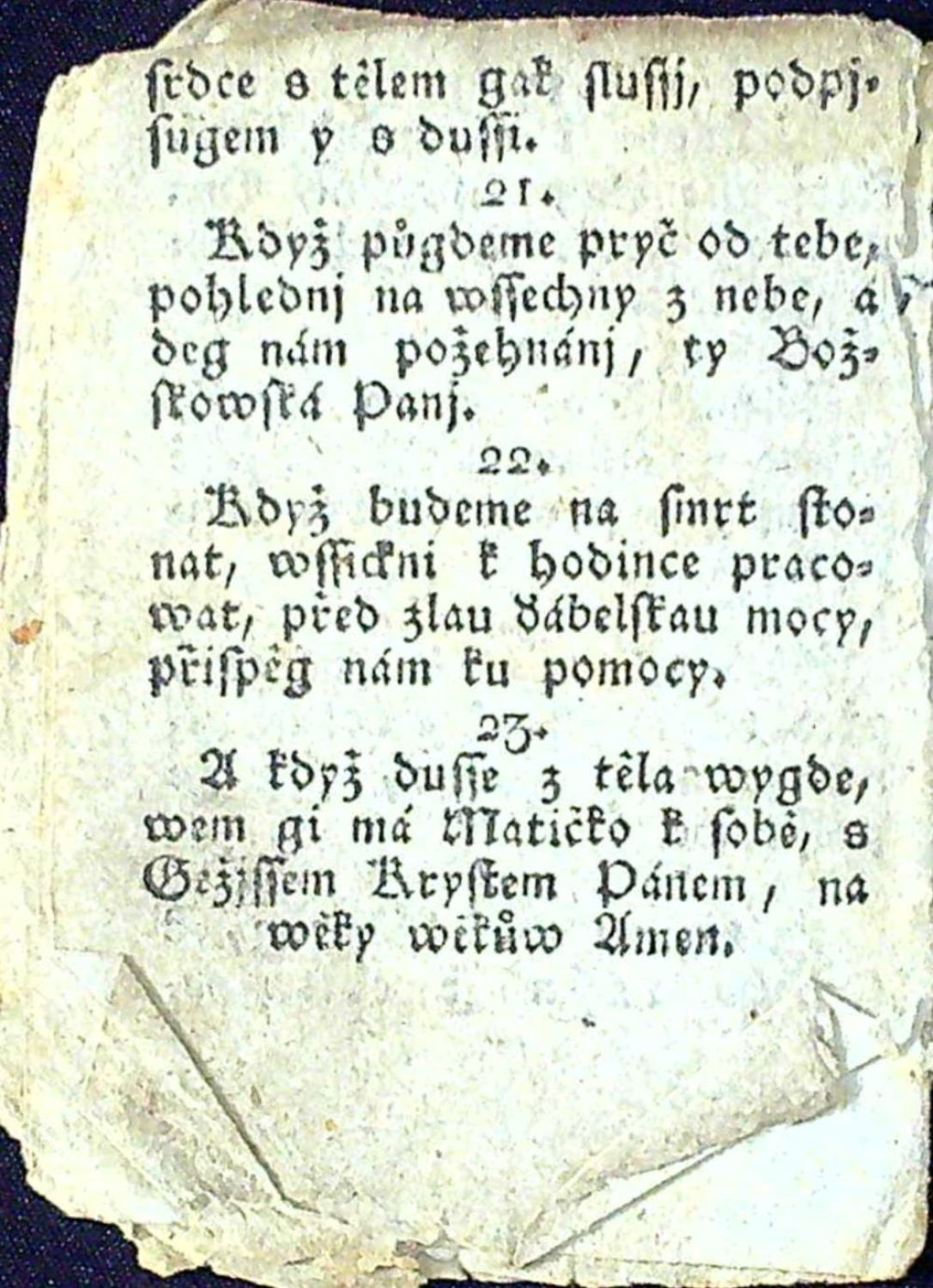 Knihopis 14420 (eviduje 2 ex., jeden z nich, námi nabízený, pochází ze sbírky Rudolfa Hlavy)<br>Tištěno švabachem, 23 arabsky číslovaných strof, na tit. listu dřevořez Panny Marie Boskovské, na rubu tit. listu v záhlaví rámeček z prolamované ozdobné lišty s drobným ornamentem uvnitř rámečku, vstupní plná iniciála ve výši dvou řádků. - Papír zahnědlý a při okrajích potrhaný.