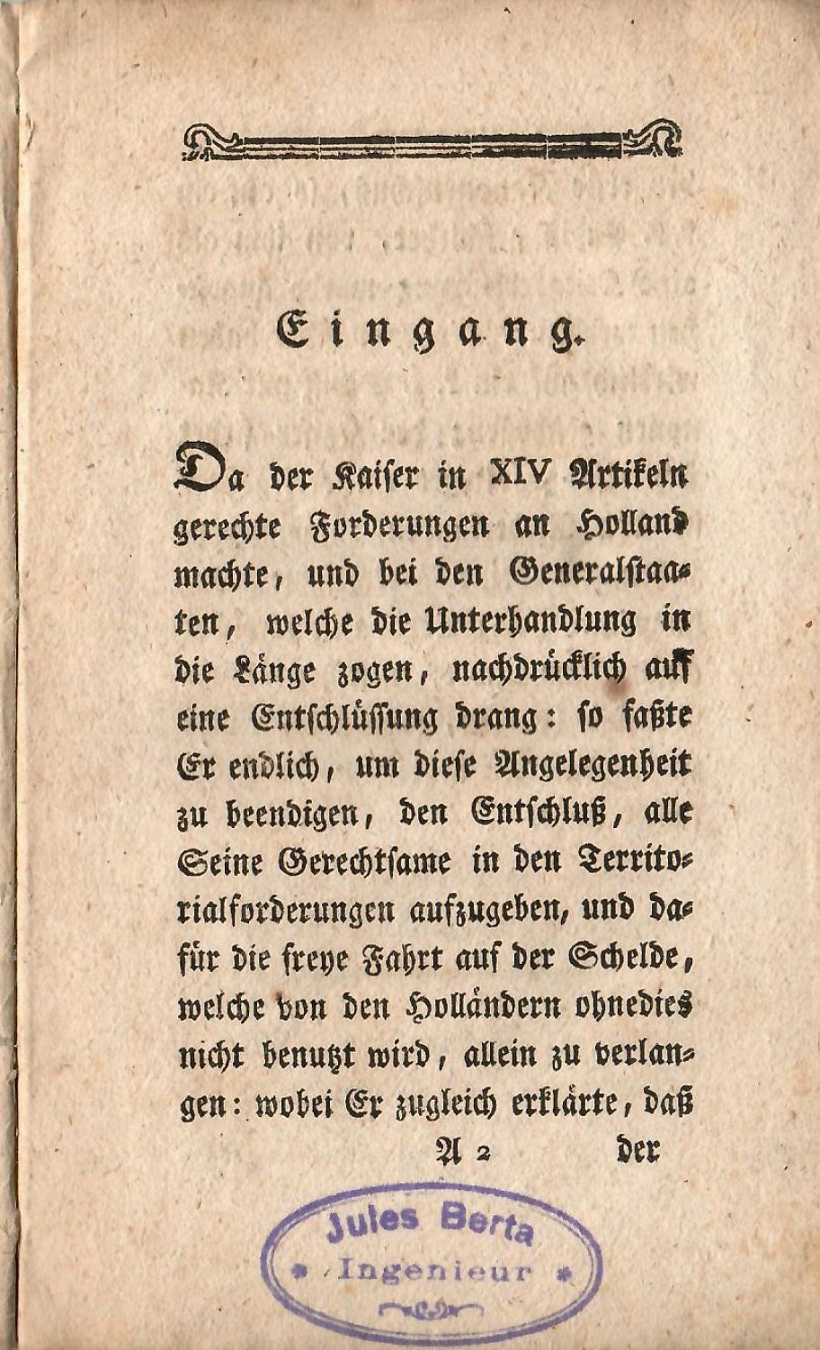 VD 18, 8003 1099-001<br>Tištěno švabachem, uprostřed horního okraje stran dvojité mizící linky, na několika stranách dvojité linky, či ozdobné lišty. Na tit. listu mědirytinová viněta ve dvojitém rámečku s mapou Holandska.<br>Dobová modrá obálka ze škrobového papíru, místy odřená a ve hřbetu místy potrhaná. Na přední předsádce starý knih. pap. štítek s číslem, na tit. listu proven. zápis perem "Jul. Berta Praha 16/IV. 1902", na druhém listu a na konci razítko "Julis Berta Ingenieur".
