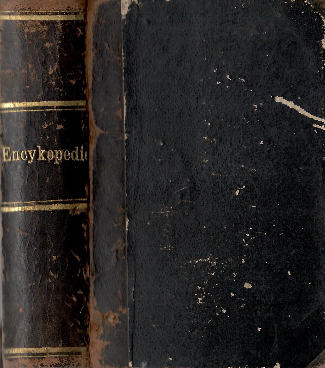 Kožený hřbet a nárožnice, desky potaženy černým papírem. Desky, hřbet i rohy knihy podřeny. Ve hřbetu tlačený a zlacený nápis "Encyklopedie". Na předním přídeští podpis černým inkoustem (pravděpodobně předchozího majitele knihy). Listy se světle hnědými skvrnami.