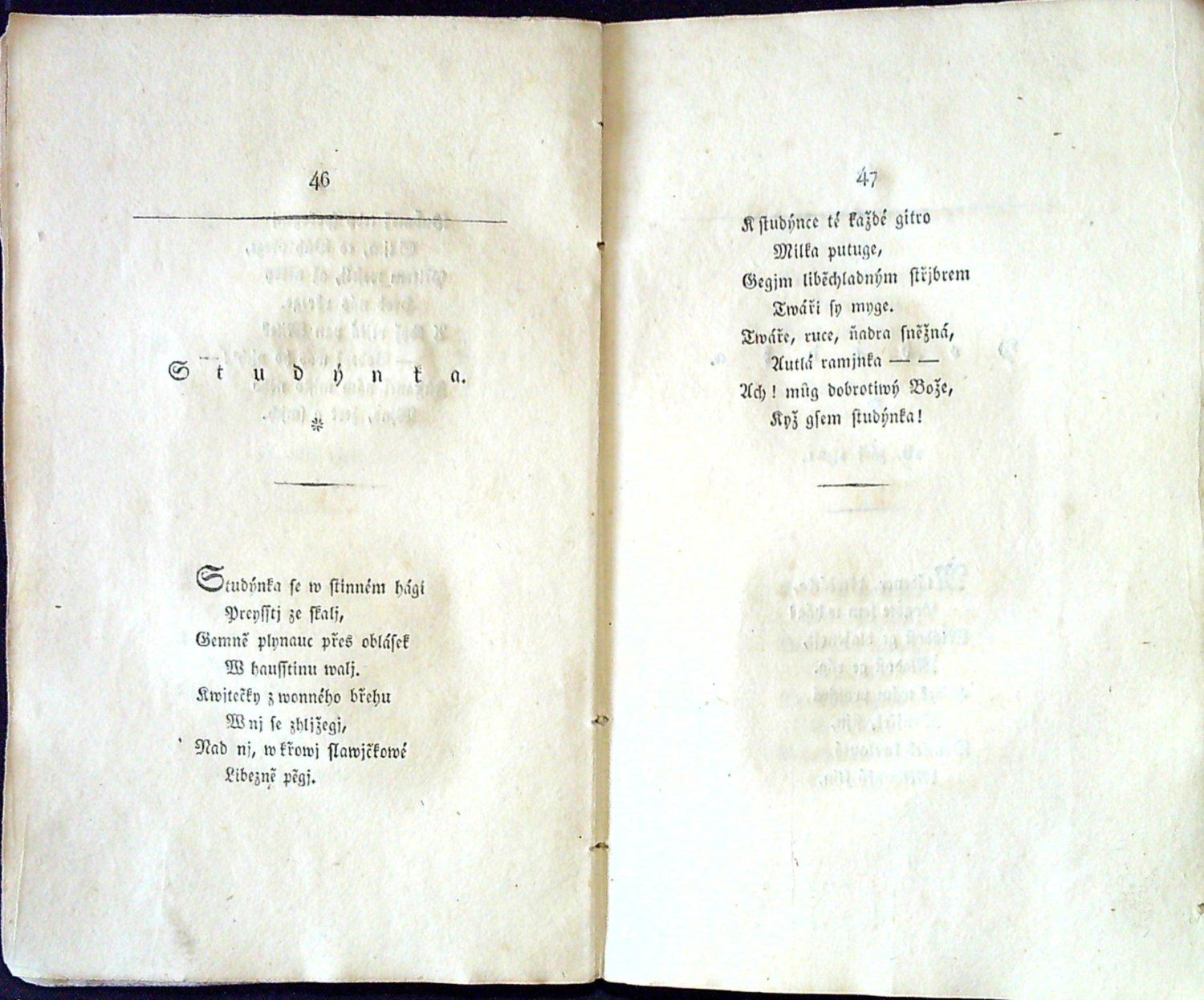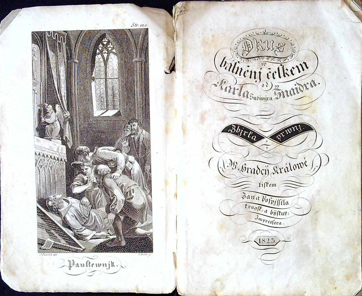 Tištěno frakturou, v záhlaví jednotlivých básní jednoduché linky, pod jejich názvem drobná tiskařská ozdůbka a mizící linka, v úvodu jednotlivých básní tučně tištěné versálky. Ve front. mědirytina "Poustevník", kterou dle předlohy J. Führicha vyryl G. Döbler. <br>Původní pap. obálka, zašpiněná, odřená, místy zkrabatělá a při okrajích potrhaná, oslí uši. - Druhý svazek sbírky vyšel roku 1830. Na rubu tištěné dedikace vlastnický přípis perem od Jiřího Šalamouna z roku 2017.