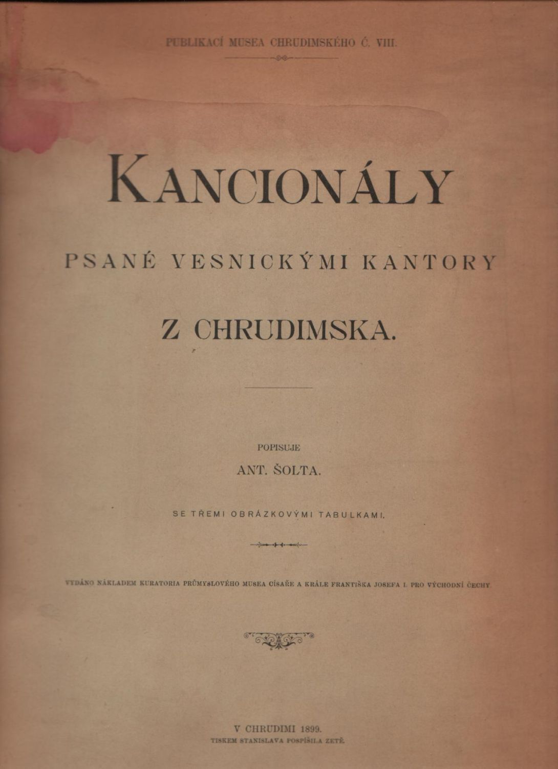 Dvoubarevně tištěný tit. list, za textem tři celostr. tabulky s vyobrazeními různých iniciál a ozdůbek ručně psaných kancionálů a modlitebních knížek z Chrudimska. <br>Obálka mírně zašpiněná, na obálce a na tit. listu rozpitá červená barva, při spodním okraji tabulky II nepatrná skvrna od vlhkosti.