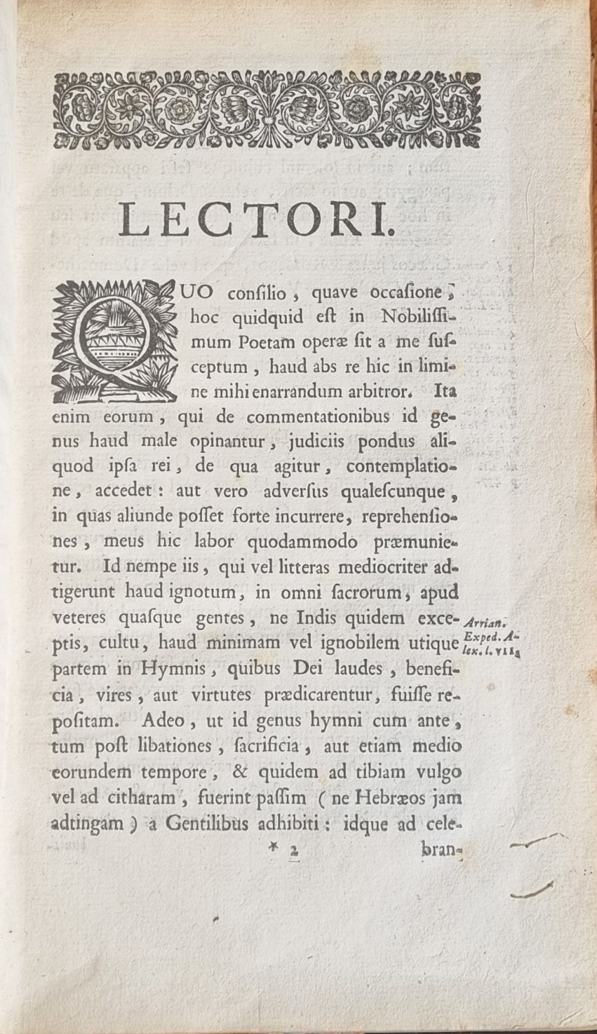 Antikva, řecká slova alfabetou, na tit. listu mědirytinová viněta, v textu cca 46 mědirytin převážně s vyobrazením řeckých mincí a medailí, na čtyřech vyobrazení Minervy, Proserpiny, sochy Diany. Živá záhlaví, dřevořezové viněty, rejstřík tištěný ve dvou sloupcích. <br>Dobová pergamenová vazba, při horním okraji hřbetu černým perem napsaný název, na přední předsádce, na tit. listu a dvou následujících listech při spodním vnějším kraji drobné stopy od červotoče, papír místy lehce zahnědlý. <br>V knize Spanheim rozebírá postupně šest hymnů Kalimachových. Ezechiel Spanheim (7.12. 1629 Ženeva - 7.11. 1710 Londýn), německý právník, filolog, diplomat a teolog švýcarského původu. Vystudoval filosofii a teologii na universitě v Leidenu, roku 1651 přijal profesoru na universitě v Ženevě. Od roku 1656 se věnoval výhradně politice, působil na dvoře falckého kurfiřta v Heidelbergu a zastupoval jeho zájmy v různých diplomatických jednáních a misích (ve Vatikánu, v Paříži, v Londýně ...). Roku 1679 byl zvolen členem Královské společnosti. Od roku 1780 působil ve službách braniborských kurfiřtů. Po vydání nantského ediktu pomohl mnoha hugenotům k emigraci z Francie do Pruska. Roku 1702 byl povýšen do šlechtického stavu. Z finančních důvodů prodal svoji rozsáhlou a vědecky velmi cennou knihovnu pruskému králi Friedrichu I. Sbíral také mince a napsal knihu o antických mincích a medailích, přeložil z řečtiny do latiny Kalimachovy Epigramy a hymny.