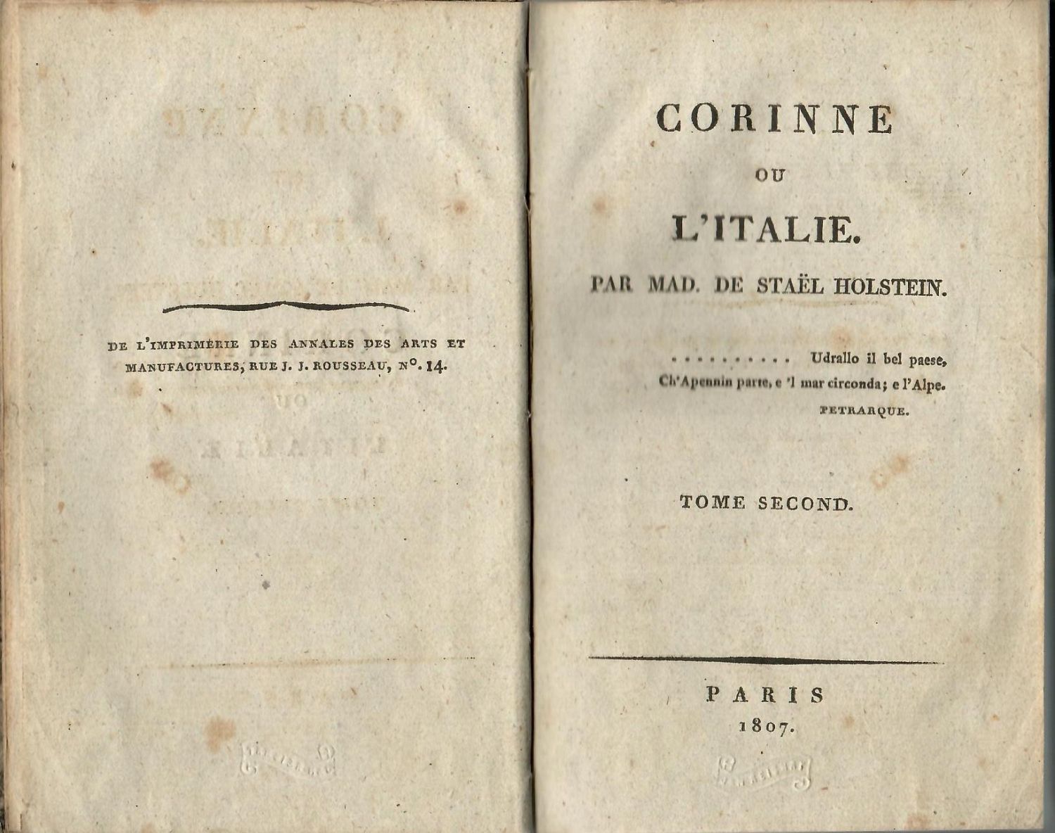 Jednotné vazby, červené hřbetní štítky se zlac. věcným názvem. Vazby odřené, průběžně hnědé skvrnky; u 1. sv. chybí patitul, tit. list je zpola odtržený, list s obsahem vevázán vzadu, kdežto ve 2. sv. vpředu. - Vydáno v roce obou prvních vydání, bez uvedení nakladatele. Původní vydání pochází z února a první oficiální z května r. 1807, obě tiskla pařížská Imprimerie des Annales, kterýžto údaj se zde nachází pouze na rubu patitulu 2. sv. Později téhož roku vydal knihu ještě H. Nicolle v Paříži (ve 3 sv.) a M. Peltier v Londýně. - Tento román zrozený z cesty do Itálie a z milostného přátelství Mme de Staël (1766-1817) s mladým diplomatem Pierrem de Souza Holstein, se stal knihou ideální lásky pro celou tehdejší romantickou generaci.