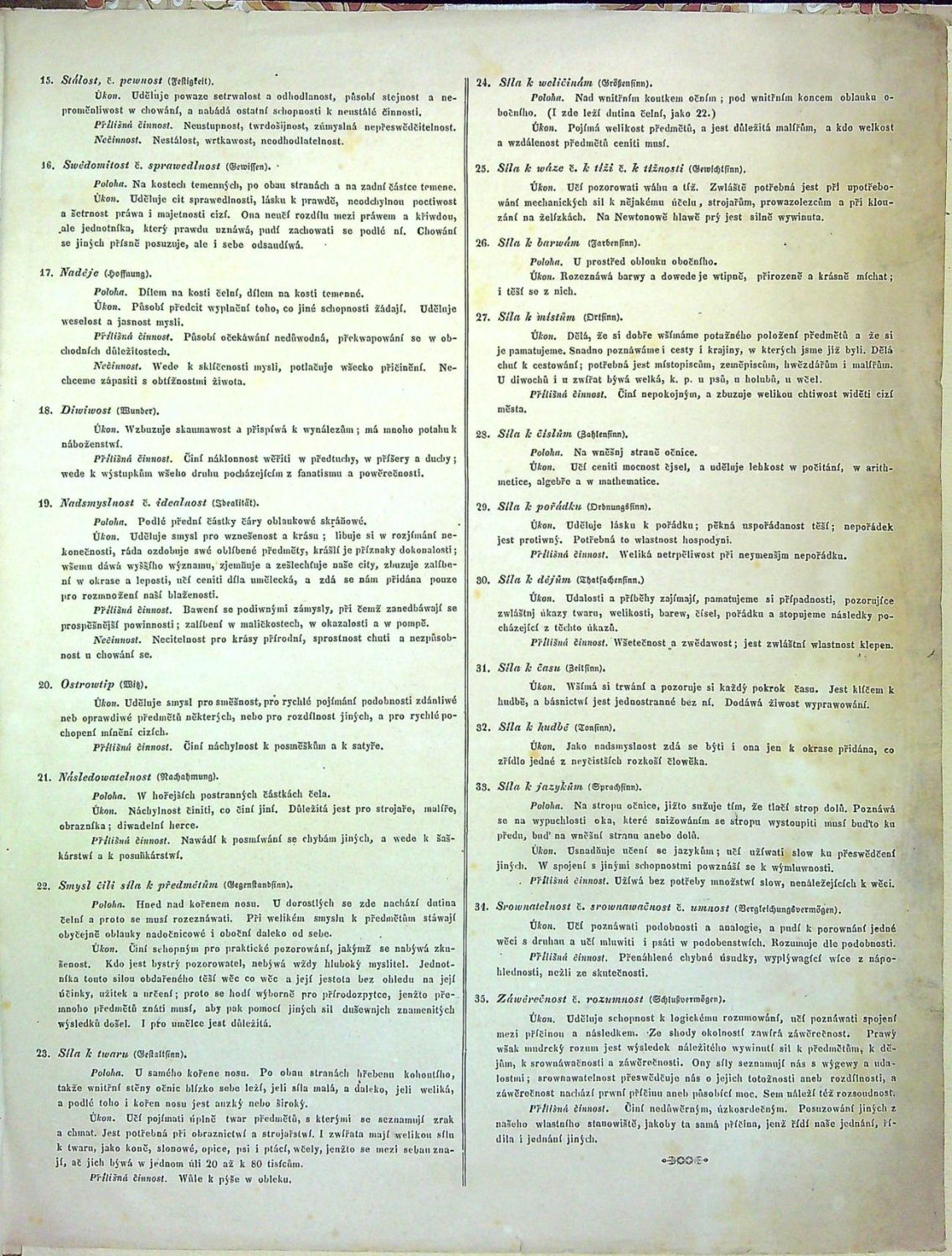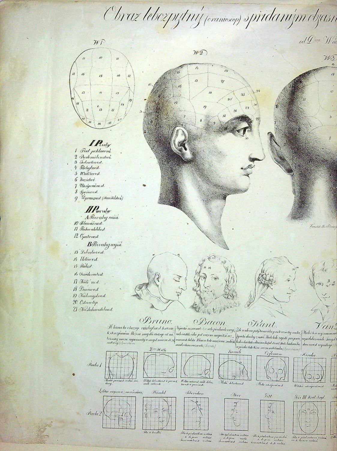 Tištěno antikvou, sazba ve dvou sloupcích od sebe oddělených dvojitou jednoduchou linkou. Vložena litografická příloha (340x515 mm) "Obraz lebezpytný (cranioscop) s přidaným objasněním smyslů (organa) i zábywů mozku" s vyobrazeními lidské hlavy s vymezením různých oblastí arabsky očíslovaných a popsaných v textu, níže portréty několika osobností (G. Bruno, F. Bacon, I. Kant, van Dyck, L. Sterne, ..) s popisem vlastností dle tvaru hlavy a dole ve dvou řádcích schematická vyobrazení lebky a hlavy různých národů a několika dalších osobností s popisem vlastností. Autorem kresebné předlohy byl malíř František Belopotocký.