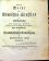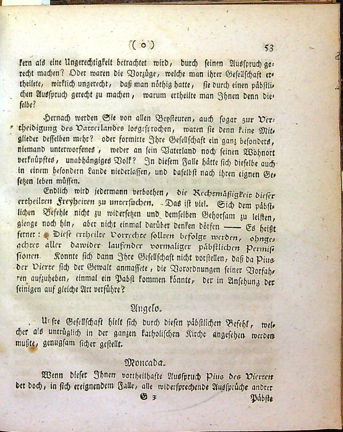 Tištěno švabachem, latinský text antikvou, na tit. listu drobná vinětka, vstupní pásový vlys s ilustrací, vstupní tučně tištěná versálka zakomponovaná v rokokovém rámci.<br>+ 1. přívazek: [Heinrich Braun] "Von der Macht des Römischen Stuhles in Aufhebung der Regular-Orden. Eine Abhandlung; der Freundschaftlichen Vertheidigung der Gesellschaft Jesu entgegengesetzt". Frankfurt und Leipzig, bez uvedení vydavatele, 1774, 24 stran, uprostřed horního okraje stran mizící ozdobná tyč, vstupní pásový vlys florálního charakteru.<br>+ 2. přívazek: [Christoph Heinrich Korn] "Gespräch im Reiche der Todten, zwischen dem Pater Angelo, einem Jesuiten, und dem Ritter von Moncada, einem ehemaligen Tempelherrn; worinn die Geschichte dieser beeden berühmten Orden, und die Aufhebung derselben, nebst andern merkwürdigen Dingen kurz und unpartheyisch erzehlet wird". [Nürnberg], 1774, 128-111-[I]-84-[IV - poslední čistá] str. + 1 mědiryt. příloha. Tištěno švabachem, latinský text antikvou, šest dílů, pět titulních listů (díl 5. a 6. se společným tit. listem), průběžná paginace po dvou dílech, ozdobné tyče, viněty, pásový vlys v záhlaví začátku 5. dílu, strana 7 5. dílu nepotištěná, za 6. dílem příloha s celostr. mědirytinou. (Holzmann-Bohatta II,7253; Wolfstieg 5133).<br>+ 4. přívazek: "Grabschrift auf die sterbende Gesellschaft Jesu, mit Anmerkungen in einem Sendschreiben erläutert". Frankfurt und Leipzig, bez uvedení vydavatele, 1774. 18 stran, tištěno švabachem, v úvodu na dvou nečísl. listech náhrobní nápis pro umírající Společnost Ježíše, na dalších čísl. listech vysvětlující poznámky k nápisu, v záhlaví pásový vlys, uprostřed horního okraje stran drobné tiskařské ozdůbky.<br>+ 5. přívazek: "Der Pfaff/ und Proiectant Ein Lehrgedicht Des Herrn °°° Auf das Jahr 1774". Petersburg (pravděpodobně fingovaný údaj, Vídeň ?), Adam Menschenfreund (pravděpodobně fingovaný údaj), [1774]. 8 nečíslovaných listů, tištěno švabachem, na tit. listu viněta, koncová viněta, v úvodu pásový vlys s drobným ornamentem v prolamovaném rámečku, iniciálky propletené úponky. (KVK ani Worldcat katalog neevidují).<br> Kartonové desky potažené škrobovým papírem, kožený hřbet a nárožnice, barvené ořízky. Ve hřbetu 5 vazů, ve druhém poli pap. štítek s psaným názvem, při spodním okraji hřbetu pap. knih. štítek s číslem. Vazba ohmataná a místy odřená, při horním i spodním okraji hřbetu kůže natržená. Na předním přídeští nalepeno mědiryt. ex libris Gustava Partheye, na rubu přední předsádky rukou psaný seznam titulů ve svazku, na tit. listu prvního díla staré razítko berlínské zednářské lóže "Zu den drei Weltkugeln".<br>Gustav Friedrich Konstantin Parthey (27.10. 1798 Berlín - 2.4. 1872 Řím), významný německý filolog a historik umění, od roku 1857 člen Pruské akademie věd. Mimo jiné autor zásadního soupisu grafických prací Václava Hollara, který vyšel poprvé tiskem roku 1853. Jeho matka byla nejstarší dcerou spisovatele, kritika a knihkupce Friedricha Nicolaie, který založil "Nicolaische Buchhandlung" v Berlíně, a které Parthey později převzal.<br>