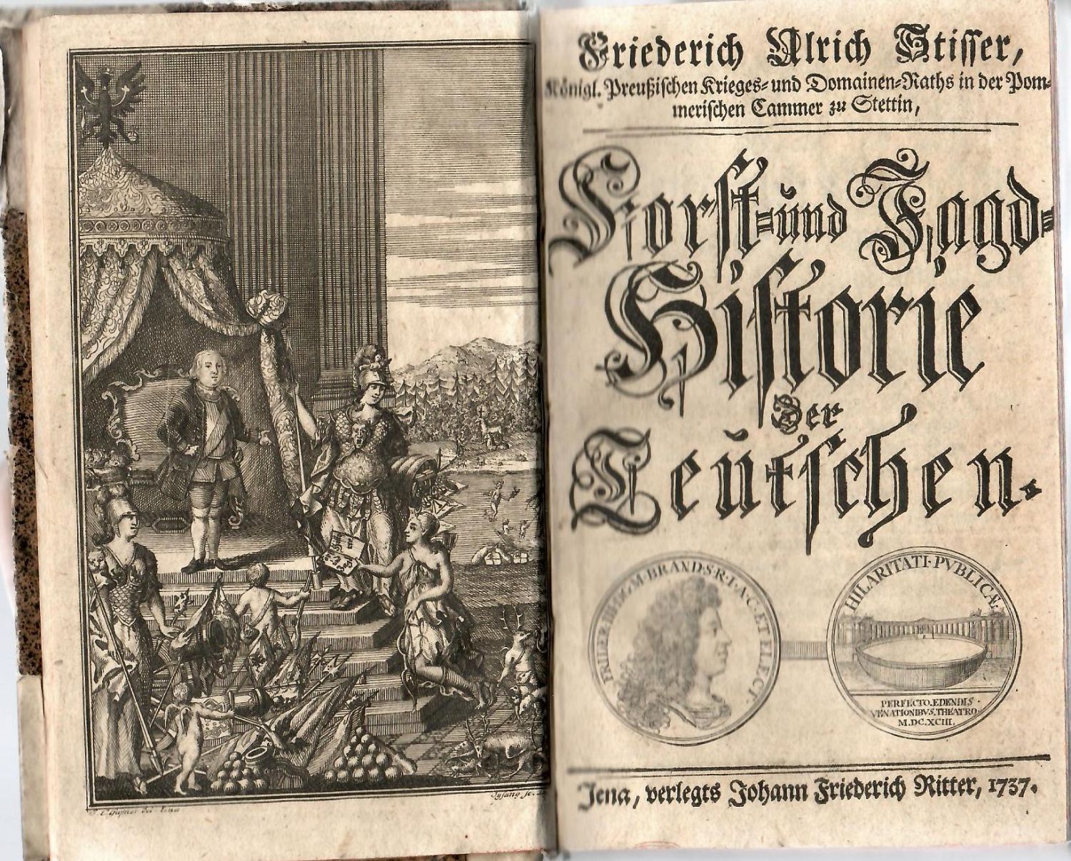 Mědiryt. alegorický front., rytý tit. list a mědiryt. viněta zobrazující souboj jelenů, v textu dřevořezové vlysy a viněty, dobová polopergamen. vazba, místy odřená, naražené rohy, červeně barvená ořízka, na přídeští staré knihovnické značky, ve stavu dobrém.<br>První vydání jedné z prvých prací o dějinách lesnictví a myslivosti v Německu.<br>Mit gest. allegor. Frontispiz, gest. Titel- und Kopfvignette.- Stellenweise leicht gebräunt. Vordervorsatz etwas beschr., sonst sauber. Halbpergament der Zeit (etwas berieben, Ecken und Kanten bestossen), Farbschnitt.<br>Erste Ausgabe des grunlegenden Werks zur Geschichte der Forstwirtschaft und des Jagdwesens in Deutschland. Mit zahlreichen Urkunden ausgestattet. Unter anderen werden auch folgende Themen behandelt: Die mancherlei Arten der Jagden in Deutschland, Forst- und Hoheitsrechte, Jagdgerichten und gebräuliche Strafen, die der Jägerei verwandten Orden, Jäger-Patronen, Jagdhäuser und Jagdzeremonien. - Der Verfasser (1689-1739), "Königl. Preussischen Krieges- und Domainen-Raths in der Pommerischen Cammer zu Stettin" widmete das Buch dem Preussens König Friedrich Wilhelm I.