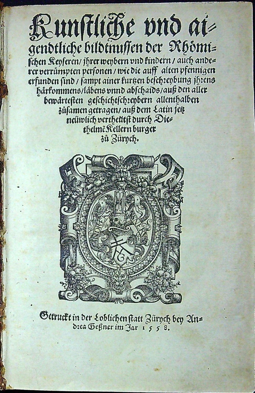 Kunstliche vnd aigendtliche bildtnussen der Rhömischen Keysern/ jhrer weybern vnd kindern/ auch anderer verrümpten personen/ wie die auff alten pfennigen erfunden sind/ sampt ainer kurtzen beschreybung jhrens härkommens/ läbens vnnd abschaids/ auss den aller bewärtesten geschichtschreybern allenthalben züsamen getragen/ auss dem Latin jetz neüwlich vertheütst durch Diethelme Kellern burger zü Zürych.