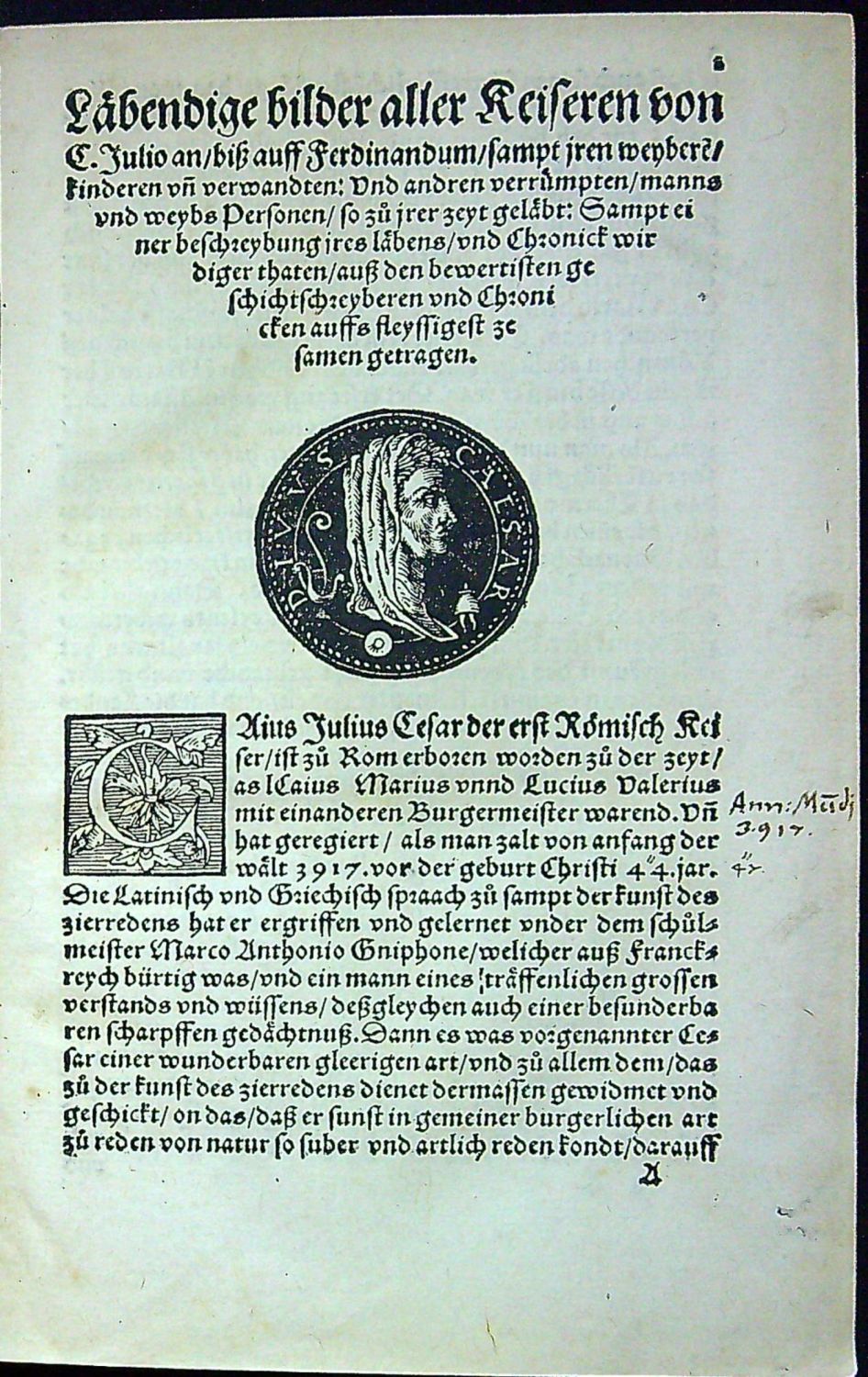 VD 16 S,9365<br>Tištěno gotikou, latinský text antikvou, na tit. listu dřevorytová viněta, konturové iniciály v jednoduchém rámečku na rostlinném pozadí zalomené do výše 6 řádků, plné iniciály ve výši 3 řádků.<br>Dobová renesanční kožená vazba z let 1562-1595, ve hřbetu 4 vazy. Přední i zadní deska zdobená zlaceným slepotiskem, v rozích vnějšího rámu ze dvojité jednoduché linky rostlinné fleurony, uvnitř rámu bordura zdobená arabeskou a uvnitř bordury oválný arabeskový kolek (stejného kolku používal knihvazač Caspar Horneffer z Augsburgu, viz EBDB w004241). Barvené ořízky, na předním přídeští nalepeno ex libris "Arturo Dazza" a černým perem starší vlastnický podpis "Hanus Gebhardt". Ochranné rozevírací kartonové pouzdro potažené zeleným plátnem (imitující knihu), na přední desce nalepená reprodukce přední desky vazby.<br>Jacopo Strada (1507 Mantova - 6.9. 1588 Praha) italský učenec, zlatník, sběratel starožitností a historik, zakladatel vědecké numismatiky a správce uměleckých sbírek Maxmiliána II. ve Vídni a Rudolfa II. v Praze. První vydání nabízeného díla vyšlo latinsky v Lyonu roku 1553 pod názvem "Epitome thesauri antiquitatum ....". Nabízené dílo je vydáním druhým a prvním německým, do německého jazyka přeložil Diethel Keller z Curychu. Kniha obsahuje životopisy a podobizny cca 630 panovníků a panovnic, od římských císařů až po Maxmiliána II., dle mincí a medailí.
