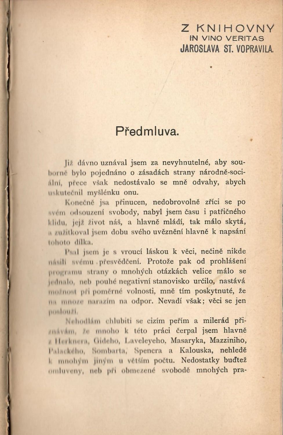 V úvodu předmluva autorova datovaná ve Vídni dne 31. prosince 1901. Vytiskla knihtiskárna Jos. B. Zápotočný v Rokycanech. - Plátěná vazba imitující kůži. Na začátku předmluvy a na konci celkem tři proven. razítka "Z knihovny In vino veritas Jaroslava St. Vopravila".<br>Jaroslav Stanislav Vopravil (1917 - 1977) novinář, redaktor a autor "Slovníku pseudonymů" česky píšících autorů.