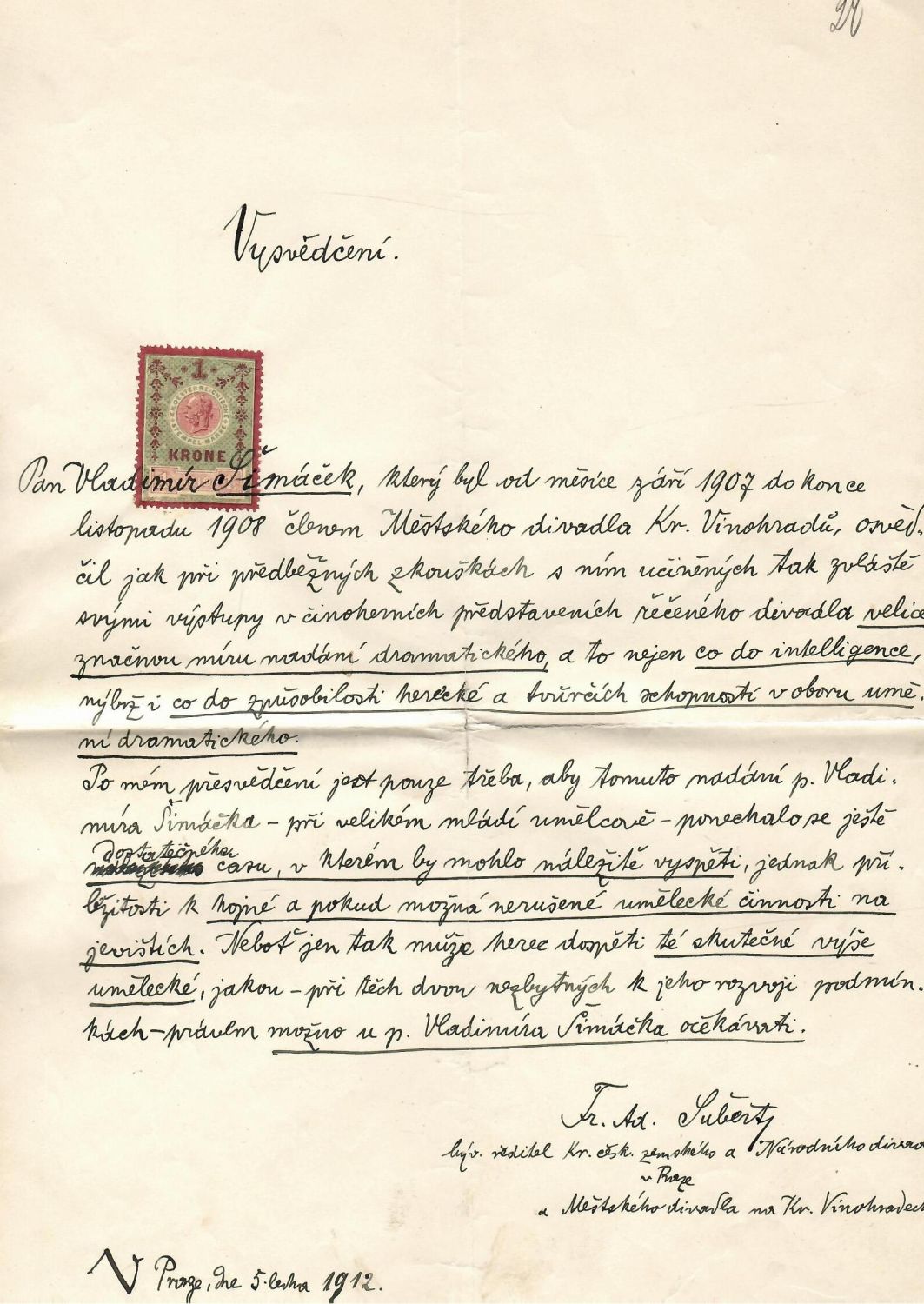 Dopis psaný perem po třech stranách dvoulistu o rozměru 18 x 13 cm datovaný 4. července 1911 v Praze-Smíchově. V psaní neurčenému adresátovi pisatel sděluje, že je ochoten v Krnově učinit přednášku o Al. Jiráskovi, žádá však, aby se přednáška konala v čase, aby byl ještě schopen se vrátit do Prahy, neb má ještě domluvenu přednášku o jemu zvláště milém V. K. Klicperovi v Chlumci. + dopis psaný perem po obou stranách lístku rozměru 17 x 11 cm datovaný 3. srpna 1911 v Praze-Smíchově, ve kterém píše panu Leopoldovi Novákovi, řediteli školy v Chlumci, že přijede přednášet o Klicperovi. + dopisnice z roku 1930 + pohlednice vydavateli Osvěty Václavu Vlčkovi z roku 1904 + vysvědčení (osvědčení) pro Vladimíra Šimáčka, člena činohry městského divadla na Vinohradech z roku 1912.