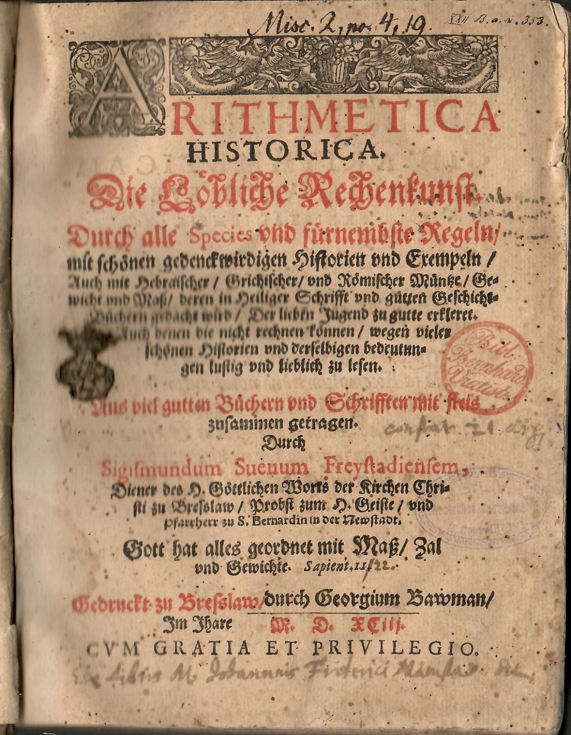 ARITHMETICA HISTORICA. Die Löbliche Rechenkunst. Durch alle Species vnd fürnembste Regeln/ mit schönen gedenckwirdigen Historien vnd Exempeln, Auch mit Hebraischer/ Grichischer/ vnd Römischer Müntze/ Gewicht vnd Maß/ deren in Heiliger Schrifft vnd gütten Geschicht=Bücherin gedacht wird/ Der lieben Jugend zu gutte erkleret. Auch denen die nicht rechnen können/ wegen vielen schönen Historien vnd derselbigen bedeutungen lustig vnd lieblich zu lesen. Aus viel gutten Büchern vnd Schrifften mit fleis zusammengetragen. Durch Sigismundum Sueuum Freystadiensem, .....