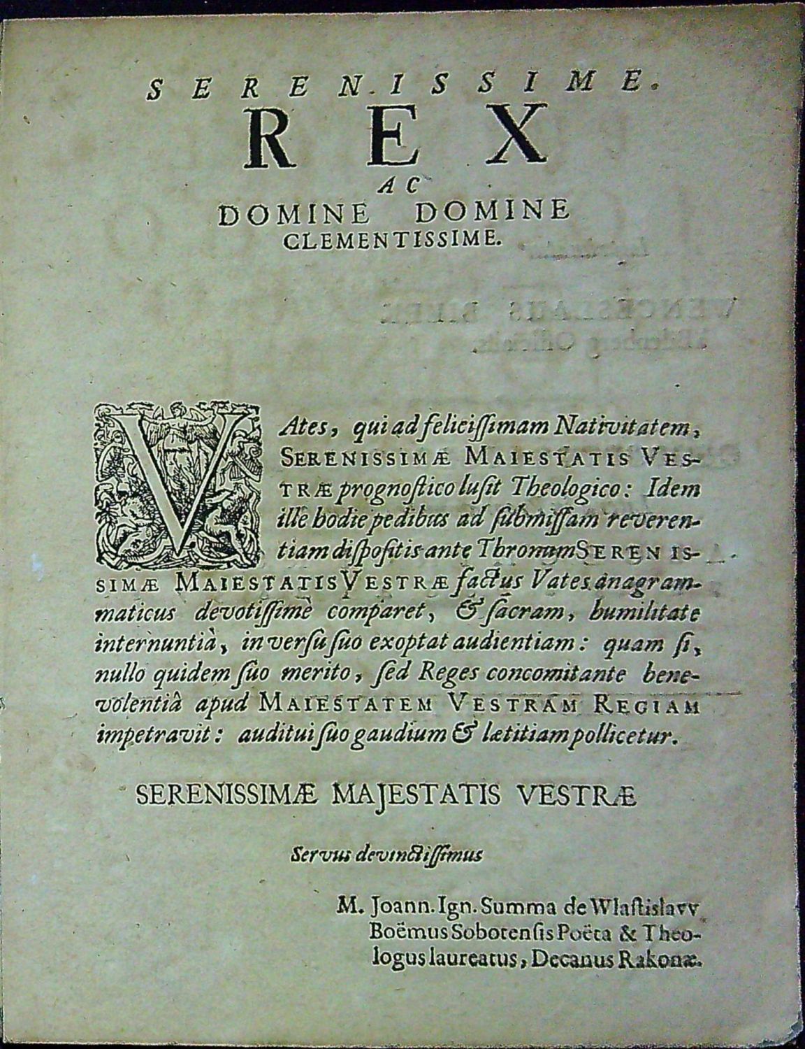 BCBT 41941<br>Tištěno antikvou, místy kurzívou, tištěné poznámky po stranách. Uprostřed horního okraje stran křížek (místy v kulatých závorkách) mezi drobnými rostlinnými tiskařskými ozdůbkami, vstupní konturová iniciála na ilustrativním pozadí zalomená do výše 5 řádků, pásová lišta z drobného ornamentu, ozdobná tyč ze sluníček, jednoduché linky. Impresum na rubu druhého listu. Signatury u prvé složky chybí (krom chybně uvedené signatury A2). <br>Knižní blok ve dvou vazech šitý nití, titulní list zašpiněný (místy šedé mapky), poslední tři listy při horním okraji s dírkami od červotoče. <br>Jan Ignác Summa z Vlastislavě (cca 1650 Sobotka - 1708 Sobotka) kněz a básník, kanovník rakovnický, od roku 1689 děkanem v Sobotce. Obdržel titul "Poeta laureatus" a snad byl v návaznosti na udělení titulu před rokem 1684 povýšen do šlechtického stavu. - Nabízená práce byla sepsána u příležitosti korunování Josefa I. Habsburského uherským králem roku 1687 v jeho devíti letech a chronogramy se vztahují výhradně k Josefově osobě.