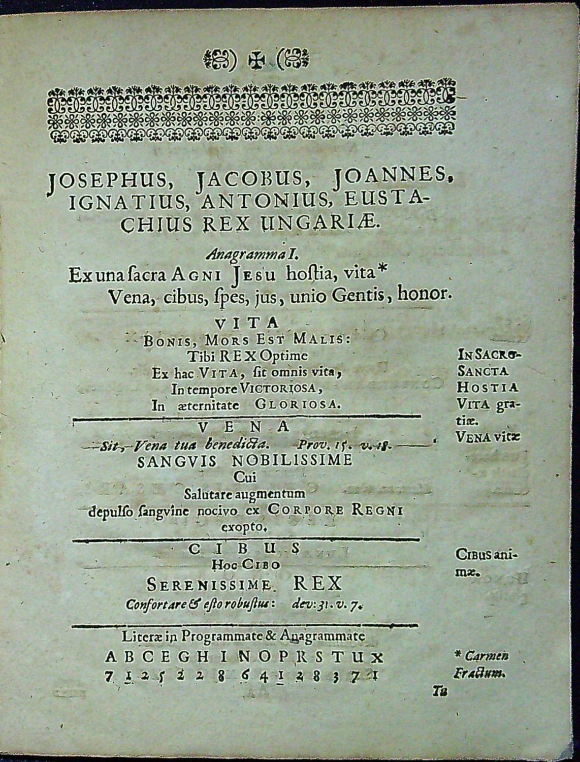VATES ANAGRAMMATICUS. EX SERENISSIMO ac POTENTISSIMO PRINCIPE JOSEPHO JACOBO JOANNE IGNATIO ANTONIO EVSTACHIO INVICTISSIMO REGE UNGARIAE FORTUNATISSIME INAUGURATO Gratulatorie festivus.