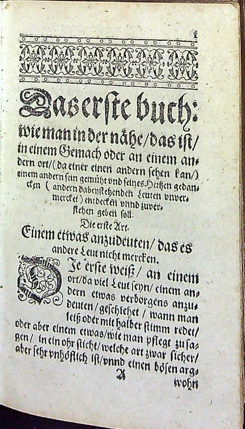 Catal. of Books in the german-speaking Countries from 1601-1700 in The British Library IV, S1687; Eymer "Pseudonymen Lexikon" str. 333.<br>Tištěno švabachem, latinský text antikvou, řecká slova alfabetou, hebrejská hebrejsky. Živá záhlaví, plné iniciály propletené úponky zalomené do výše 3-5 řádků, pásové vlysy z ornamentů, rostlinné a ornamentální viněty, na straně 303-304 tištěná notace, číselné tabulky, tabulky z písmen abecedy, kabalistická abeceda, ukázky tajného písma. V úvodu dedikační přípis a předmluva podepsaná Jan. Hercul. de Sunte, na konci rejstřík, v kolofonu uvedeno místo tisku (Norimberk) a jméno tiskaře (Ludwig Lochner). Místy chyby v paginaci. <br>Dobová pergamenová vazba, barvené ořízky, na obou deskách nepatrná torsa vázacích tkanic. Při horním okraji hřbetu inkoustem první slova názvu knihy, ve spodním jeho okraji starý pap. štítek s číslem. Vazba ohmataná a zašpiněná. Na předním přídeští černým perem proven. přípis z 18. století, papírový štítek z 19. století "Eingetragen der Bibliothek der Freimaurer Loge" a razítko z počátku 20. století "Bibliothek der Loge zu Münster i W", na rectu listu )(II stejné razítko. Chybí titulní list, list )(VI při spodním okraji podlepený (cca 1 cm x O,5 cm), list )(10 podlepený při vnějším okraji a strana 9 podlepená při vnějším spodním okraji, místy papír lehce zahnědlý a na několika listech drobné hnědé skvrnky. <br>Daniel Schwenter, též Schwender (31.1. 1585 Norimberk - 19.1. 1636 Altdorf) německý orientalista, matematik, vynálezce, básník. Profesor orientálních jazyků a matematiky na universitě v Altdorfu (od roku 1606 profesor hebrejštiny, od roku 1625 všech orientálních jazyků a od roku 1628 řádným profesorem matematiky). Autor několika knih o matematice a geometrii, Talmudu. - Velmi vzácné a na trhu se neobjevující, kuriosní dílo, které autor publikoval pod výše uvedenými pseudonymy. Prvé vydání (rovněž bez datace) vyšlo pravděpodobně roku 1620 u stejného nakladatele a mělo pouze 299 stran vlastního textu.
