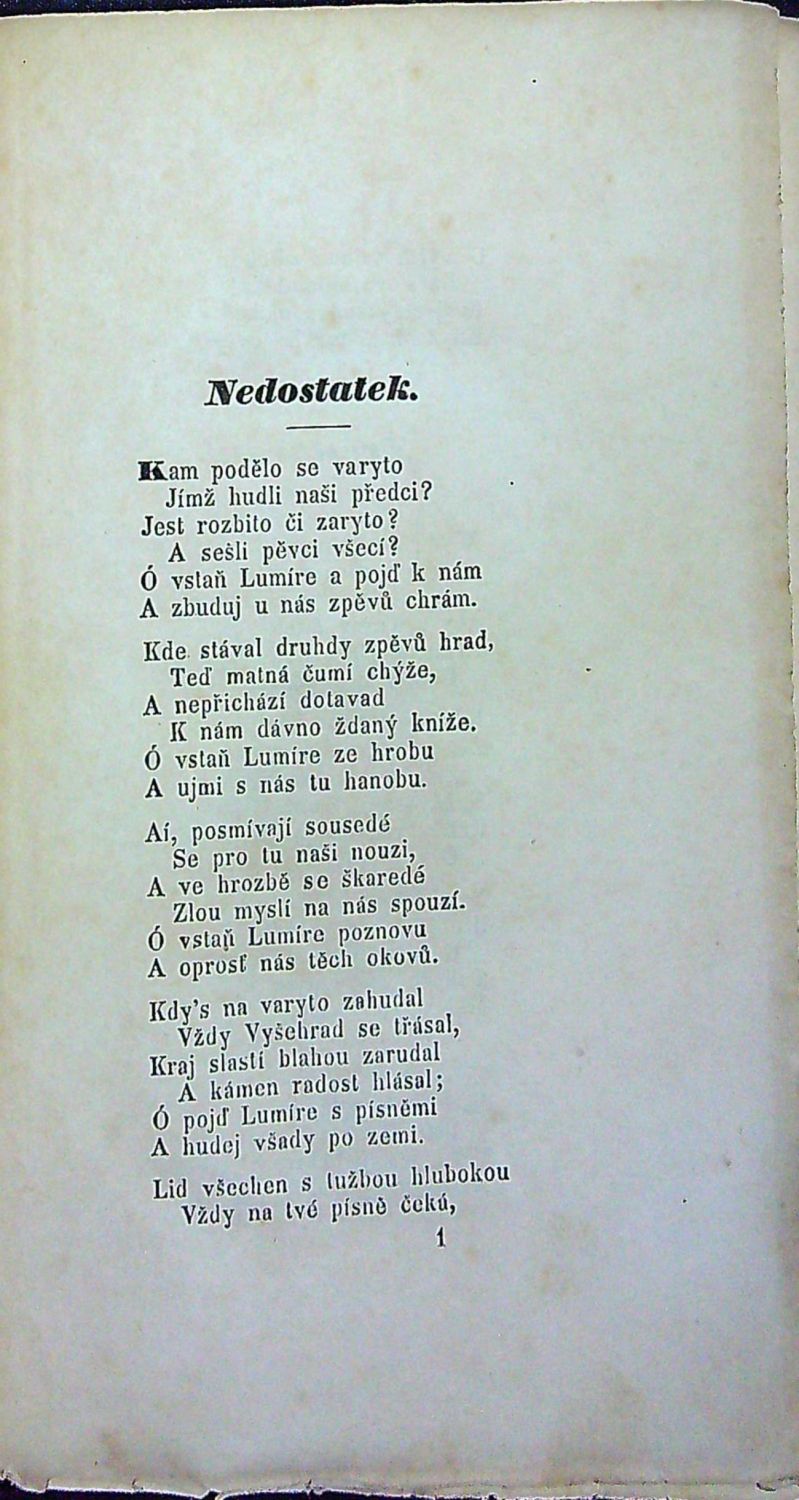 Tištěno antikvou, tučně tištěné názvy jednotlivých básní. - Původní pap. obálka přes hřbet přelepená průsvitnou lepící páskou, přední strana obálky při vnějším okraji potrhaná, oslí uši, knižní blok neoříznutý. Místy drobné hnědé skvrnky.