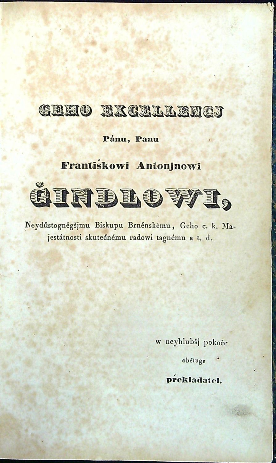 Tištěno antikvou, arabsky číslované poznámky pod čarou, tučně tištěné nadpisy jednotlivých spisů, ozdobné a mizící tyče. - Dobová kartonová vazba potažená mramorovaným papírem, místy lehce odřená, naražené rohy, papír zahnědlý s drobnými světle hnědými flíčky.