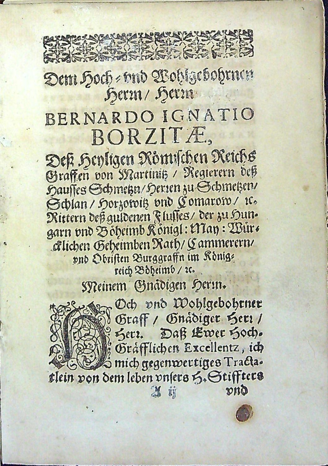 BCBT 41973<br>Tištěno švabachem, latinský text antikvou, plné iniciály propletené úponky zalomené do výše 3-5 řádků, ozdobné lišty z rostlinných ornamentů, koncová tiskařská ozdůbka. Kniha je dedikována Bernardu Ignáci Bořitovi z Martinic. <br>Dobová vazba, kartonové desky potažené pergamenem. Vazba zašpiněná a místy odřená, knižní blok zčásti rozvolněný, první arabsky číslovaná strana z knižního bloku uvolněná. Chybí titulní list. Na zadní předsádce vlastnické razítko "MUDr. František Bezecný".<br>Bernard Sutor, premonstrát, v letech 1649-1656 působil jako farář u sv. Jakuba v Jihlavě.