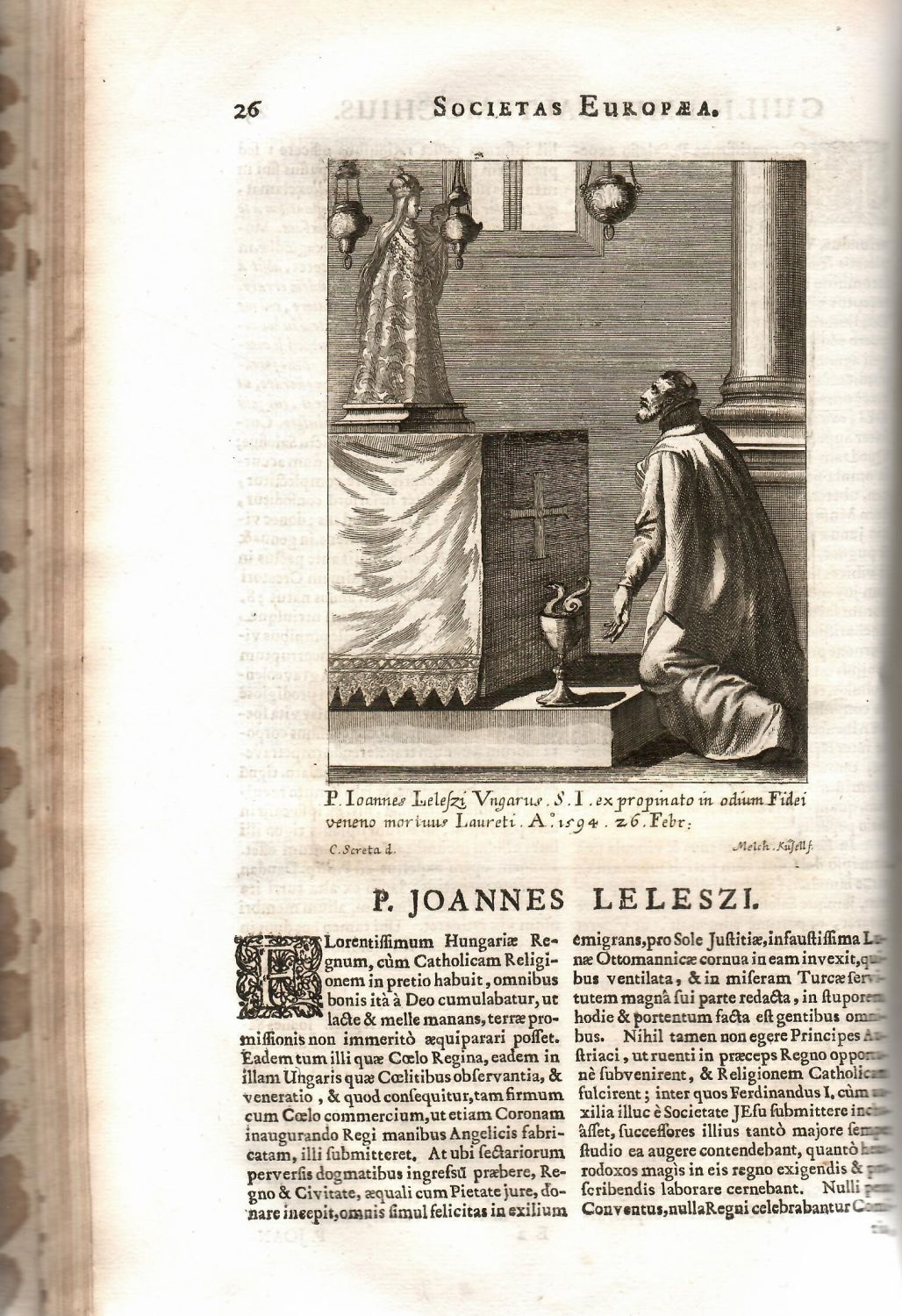 Zíbrt III,7397, Zíbrt V,30781; Backer-Sommervogel VII,1860; Graesse VI,25; Pumprla T4600; BCBT31172<br>Antikva, tisk z větší části ve dvou sloupcích, živá záhlaví, konturové iniciály na rostlinném a ornamentálním pozadí zalomené do výše 4-7 řádků, tučně tištěné versálky ve výši 2 řádků, viněty (s květinovým motivem, s maskaronem, s hlavou ženy, s jesuitským emblémem a andílky, typografické, s granátovými jablky). V textu 169 mědirytin v jednoduchém rámečku (cca 150 x 110 mm) s rytým textem dole, signovaných Melchior Küssel fecit, C. Skreta del. Ve front. celostr. mědirytina s jesuitským emblémem ve vavřínovém věnci obklopeném anděli, pod ním různé mučednické výjevy a anděl přemáhající nepřátele Církve; na foliu A4a celostránková mědirytina v jednoduchém rámečku s vyobrazením palmy obklopené kacíři a pohany, dole postava Evropy sedící na býku; na foliu X1a (nepag. strana 151) celostr. mědirytina s vyobrazením arény posetou kostmi, s dravou zvěří a na podstavci stojícím andělem s křížem a rozevřenou knihou; na foliu Ee1a (nepag. strana 207) celostr. mědirytina s vyobrazením hřbitova a andílky kropících krví jezuitských mučedníků hroby, dole troubící stádo slonů a postava ve fezu na velbloudu s vavřínem v ruce, nahoře stuha nesená andílky s rytým nápisem "Sangvis Martyrum Semen Christianorum" (Krev mučedníků je semenem křesťanů); na foliu Kk2a (nepag. str. 433) celostr. mědirytina s alegorickým výjevem vztahujícím se k působení jezuitských misionářů v Americe, rytiny jsou vpravo dole signovány v desce Melchior Küsell f., vlevo dole C. Screta del., na rytinách v textu vyobrazení mučednických smrtí jezuitských misionářů. <br>Dobová vazba z hnědé hověziny, ve hřbetu 5 vazů, ve druhém poli světlý kožený štítek s tlačeným a zlaceným názvem. Při spodním okraji hřbetu mírně natržený kožený pokryv, lehce naražené rohy, na front. a prvých třech listech při vnitřním okraji cestička od červotoče, na stejných listech až po stranu 25 v horní části při vnitřních okrajích postupně mizící světle hnědá skvrna způsobená pravděpodobně neopatrným pijákem kávy, papír místy lehce zahnědlý.<br>Matěj Tanner (28.2. 1630 Plzeň - 8.2. 1692 Praha), rektor pražské jesuitské koleje, šest let hlava české řádové provincie. Se svým starším bratrem Janem prováděl misijní činnost na Těšínsku, ve svých pracích se zaměřil na historii jezuitského řádu. Popsaná kniha je jeho nejvýznamnějším dílem, popisuje život a smrt jezuitských misionářů během svých misií v Americe, Asii, Africe a Tichomoří. Na knize se významně podílel Karel Škréta, autor předloh pro rytiny, které vytvořil významný augsburský rytec Melchior Küsel.