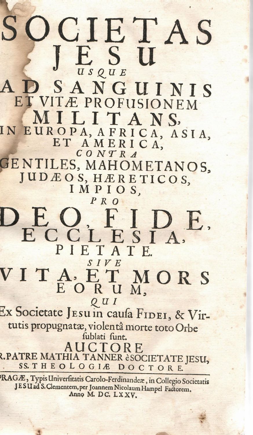 SOCIETAS JESU USQUE AD SANGUINIS ET VITAE PROFUSIONEM MILITANS, IN EUROPA, AFRICA, ASIA, ET AMERICA, CONTRA GENTILES, MAHOMETANOS, JUDAEOS, HAERETICOS, IMPIOS, PRO DEO, FIDE, ECCLESIA, PIETATE. SIVE VITA, ET MORS EORUM, QUI Ex Societate Jesu in causa Fidei, & Virtutis propugnatae, violenta morte toto Orbe sublati sunt.