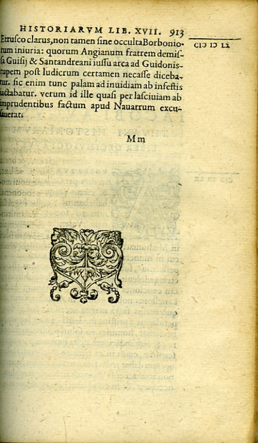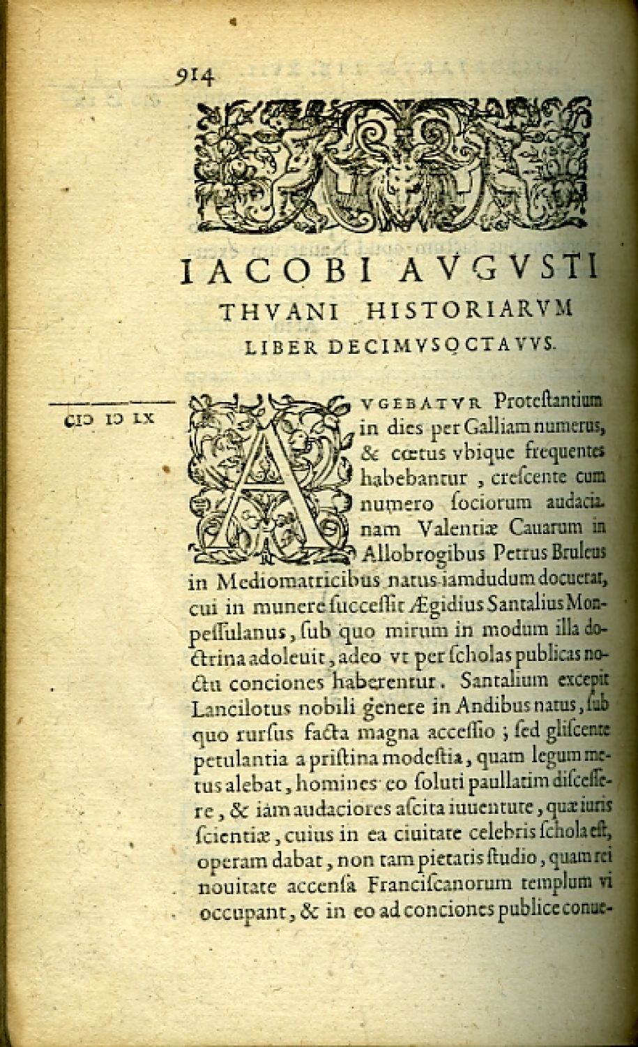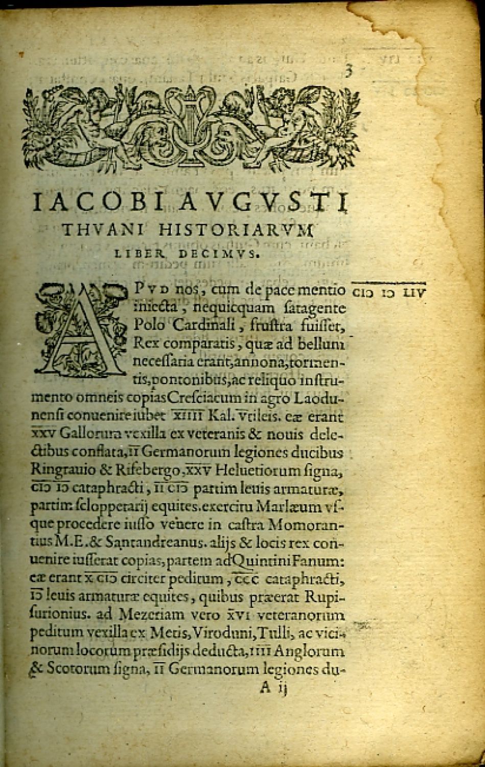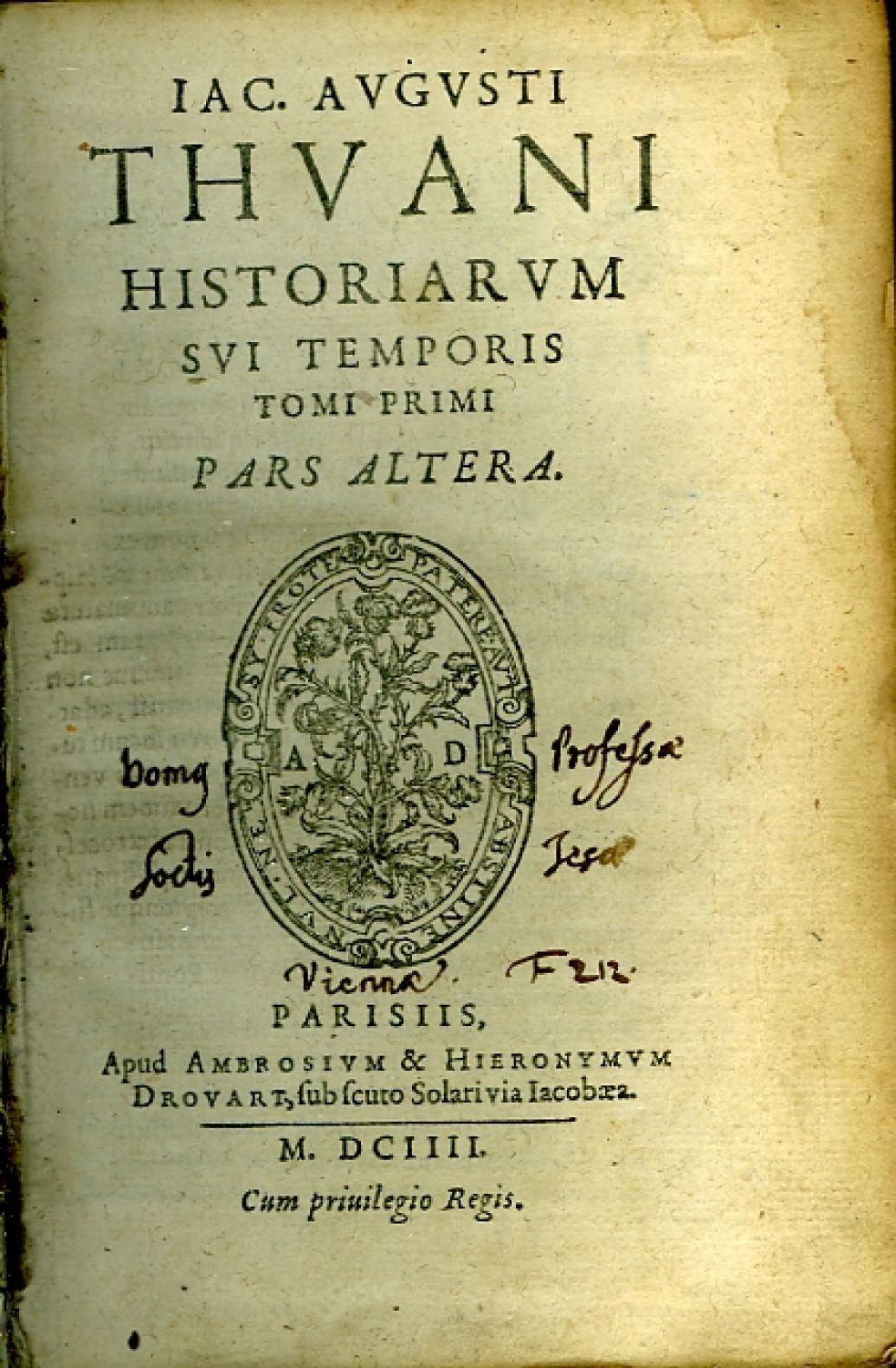 Brunet 4-2,474<br>Na titulním listu signet tiskařův, živá záhlaví tištěná versálkami, po stranách při horním okraji pod krátkou linkou datace obsahu jednotlivých knih (kniha obsahuje část 10. - 18.), v záhlaví jednotlivých knih pásové vlysy s postavami andílků a různými ornamenty, v úvodu textu konturové iniciály na rostlinném a ornamentálním pozadí zalomené do výše 6-9 řádků, na konci 17. knihy viněta. - Dobová pergamenová vazba, ve hřbetu 4 vazy, barvené ořízky, v prvním poli hřbetu inkoustem psaný název, ve druhém a pátém poli stará knih. čísla. Vazba zašpiněné a mírně odřená, desky lehce pokroucené, předsádky zašpiněné, na prvních 3O stranách při vnějším okraji nahnědlé mapky od vlhkosti. Na tit. listu provenienční vídeňský přípis perem. Nabízená kniha je druhou částí prvého svazku 2. vydání (prvního vydaného ve formátu 8°). První vydání vyšlo téhož roku ve dvou foliovývh svazcích v Paříži u Mamerta Patissona a Roberta Estienna. První část druhého vydání vyšla r. 1604, další díl 1606 a poslední 1607 u Ambrosia a Hieronyma Drouarta. <br>Jacques-Auguste de Thou (8.10.1553 Paříž - 7.5.1617 Paříž), francouzský státník, historik a sběratel. Pro své nestranné postoje k dobovým událostem a kritickou prací s dobovými prameny patří mezi průkopníky ve vědeckém přístupu k historii. Roku 1595 se stal předsedou francouzského parlamentu a hlavně jeho zásluhou byl roku 1598 přijat Nantský edikt mezi katolíky a hugenoty. Přivodil si tím nepřátelství ze strany církevní hierarchie, které se zvýšilo po vydání jeho historie v roce 1604. Ve svém díle nestranně popisuje dobové události, první díl končí rokem 1560, druhý zachycuje období mezi lety 1560-1572 (zabývá se náboženskými válkami a zvláštní pozornost věnuje masakru Bartolomějské noci), třetí díl popisuje události z let 1572-1574 a čtvrtý 1574-1584. Dílo vyvolalo mohutný odpor v církevních kruzích a 2. až 4. díl byly zařazeny do soupisu církví zakázaných knih. - Na trhu se toto vydání objevuje jen vzácně a vlastní jej pouze několik málo knihoven z celého světa. Fond NK ČR obsahuje prvou část prvého dílu, díl druhý a třetí.