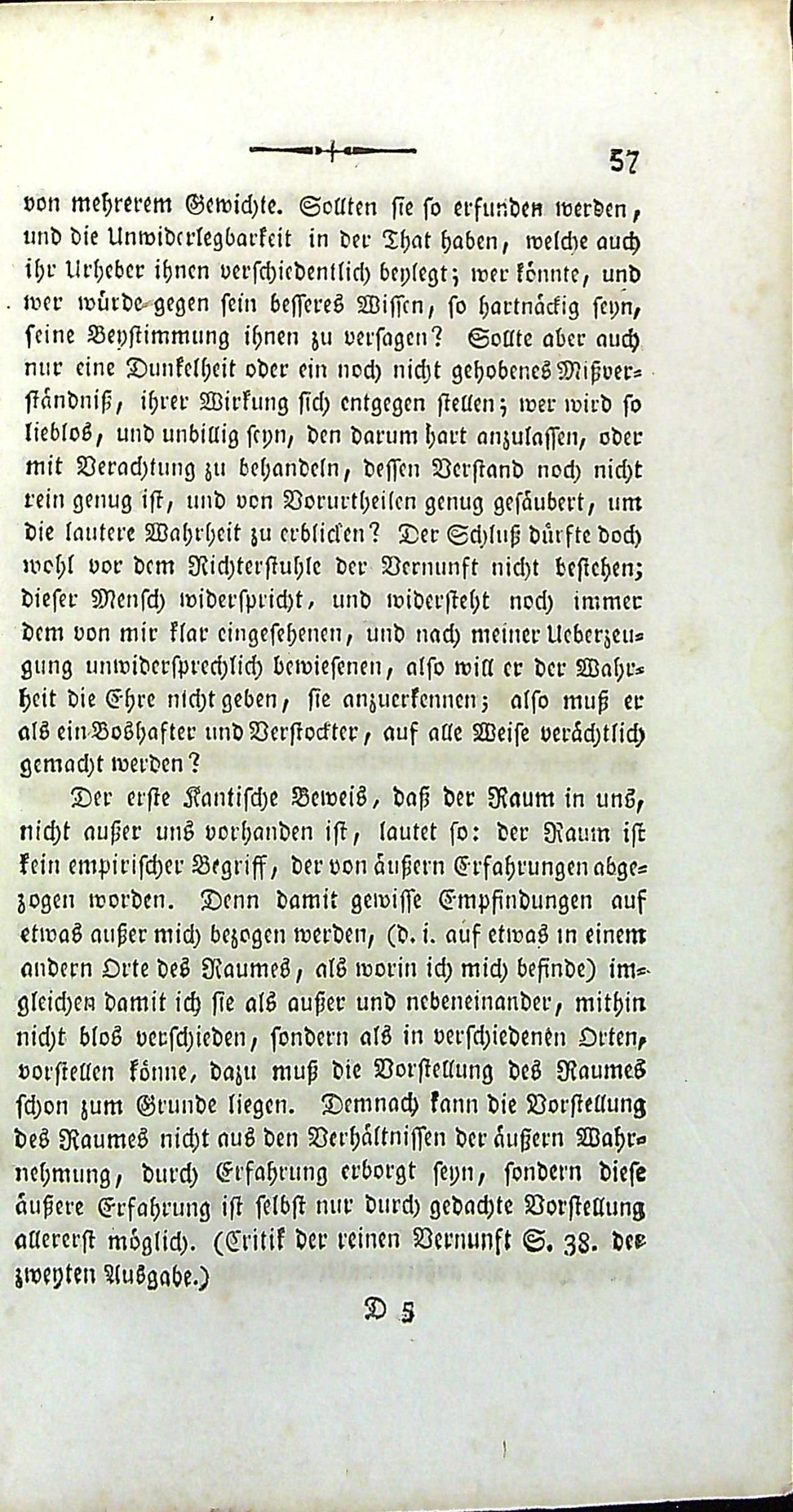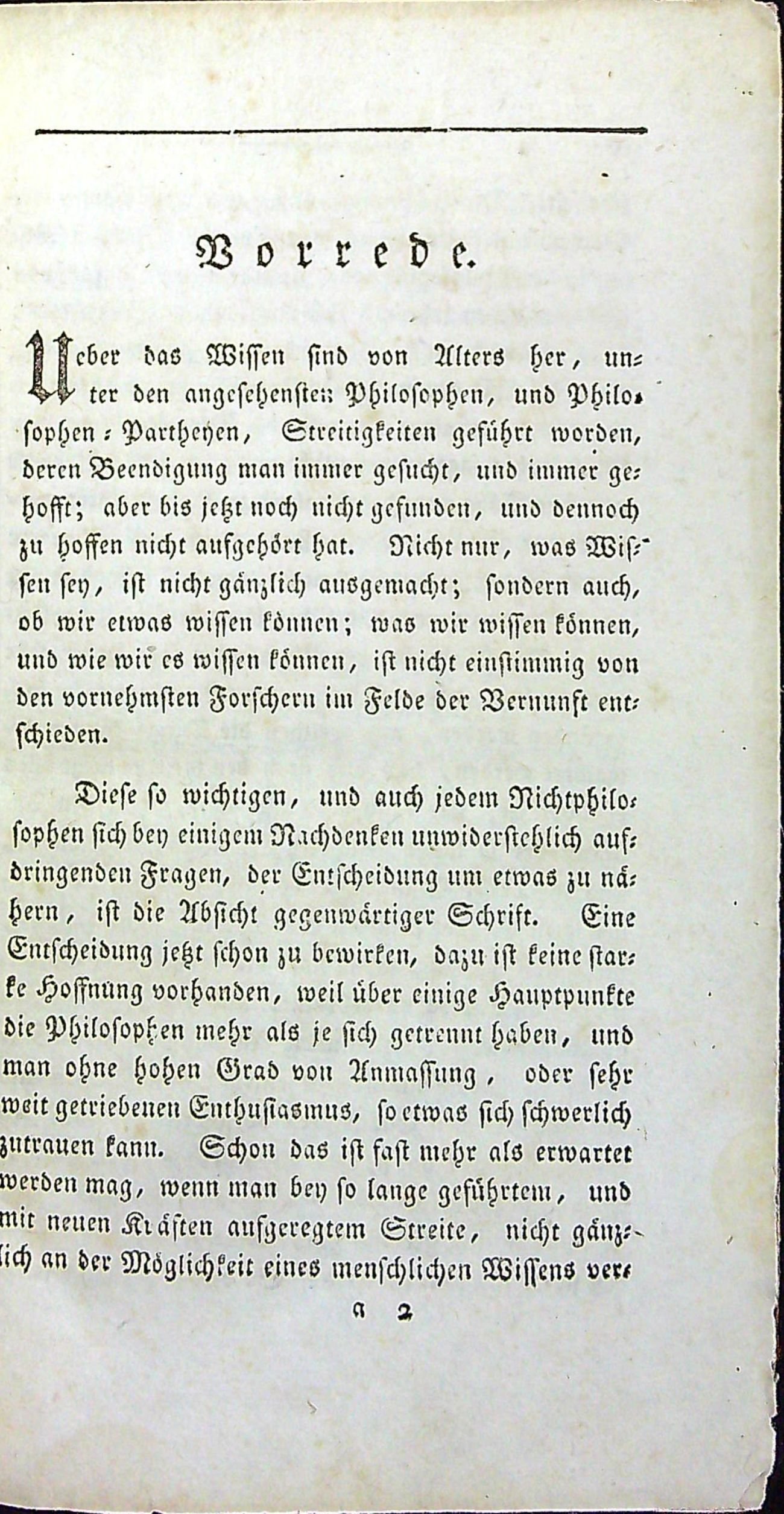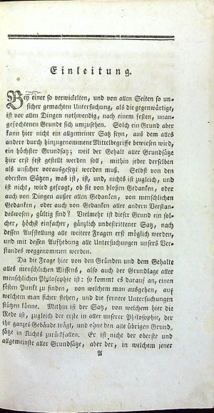 Kartonové desky potažené modrým škrobovým papírem, kožený hřbet a nárožnice, hřbet dělený zlacenými lištami do 6 polí, ve druhém poli kožený štítek s tlačeným názvem. Vazba ohmataná a místy odřená, kůže při spodním okraji hřbetu natržená, naražené rohy, chybí spodní kožená nárožnice na přední desce a na zadní desce torso horní nárožnice. Papír místy lehce zahnědlý a na několika listech drobné světle hnědé skvrnky způsobené kyselostí papíru. Na předním vakátu vlastnický přípis v českém jazyce datovaný 1862 "Fr. Jos. ? kandidat pro české reálky" a pod ním několik poznámek se vztahem k "vědění". První vydání velmi vzácné práce, která se kriticky vymezuje ke Kantově kritice rozumu.