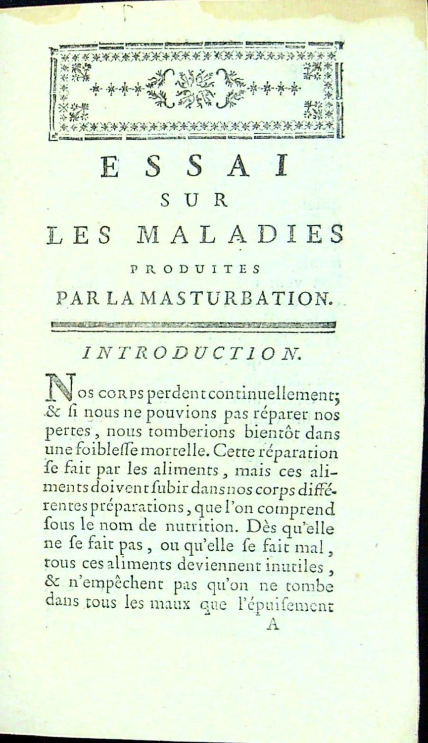 Hirsch V,594-95; Waller 9613<br>Na tit. listu drobná viněta, neživá záhlaví, vstupní pásový vlys z drobných ornamentů, tučně tištěné versálky.<br>Dobová vazba s karto. deskami potaženými mramorovaným papírem, kožený hřbet a nárožnice, ve hřbetu 5 vazů, ve druhém poli původní světlý kožený štítek s tlačeným názvem, červeně barvené ořízky. Vazba místy lehce odřená, naražené rohy, při horním okraji stran světle hnědé drobné mapky od vlhkosti (do strany 90), na několika listech při vnitřním okraji drobné cestičky od červotoče. <br>Samuel Auguste André David Tissot (20.3. 1728 Grancy - 13.6. 1797 Lausanne), významný švýcarský lékař, neurolog a profesor. Nabízené dílo vydal poprvé roku 1760, v práci autor píše o škodlivých účincích masturbace, sperma je dle autora "esenciální olej" a "stimul", který, když se z těla ztratí ve větším množství, způsobí citelné snížení síly, paměti, rozumu, způsobuje rozmazané vidění, nervové poruchy, dnu a revmatismus. Pojednání mělo velký vliv po dvě století na vnímání masturbace v západní evropské medicíně (jeho argumenty byly mimo jiné uznány a šířeny i Kantem, Voltairem...) jako škodlivé a vysilující nemoci.