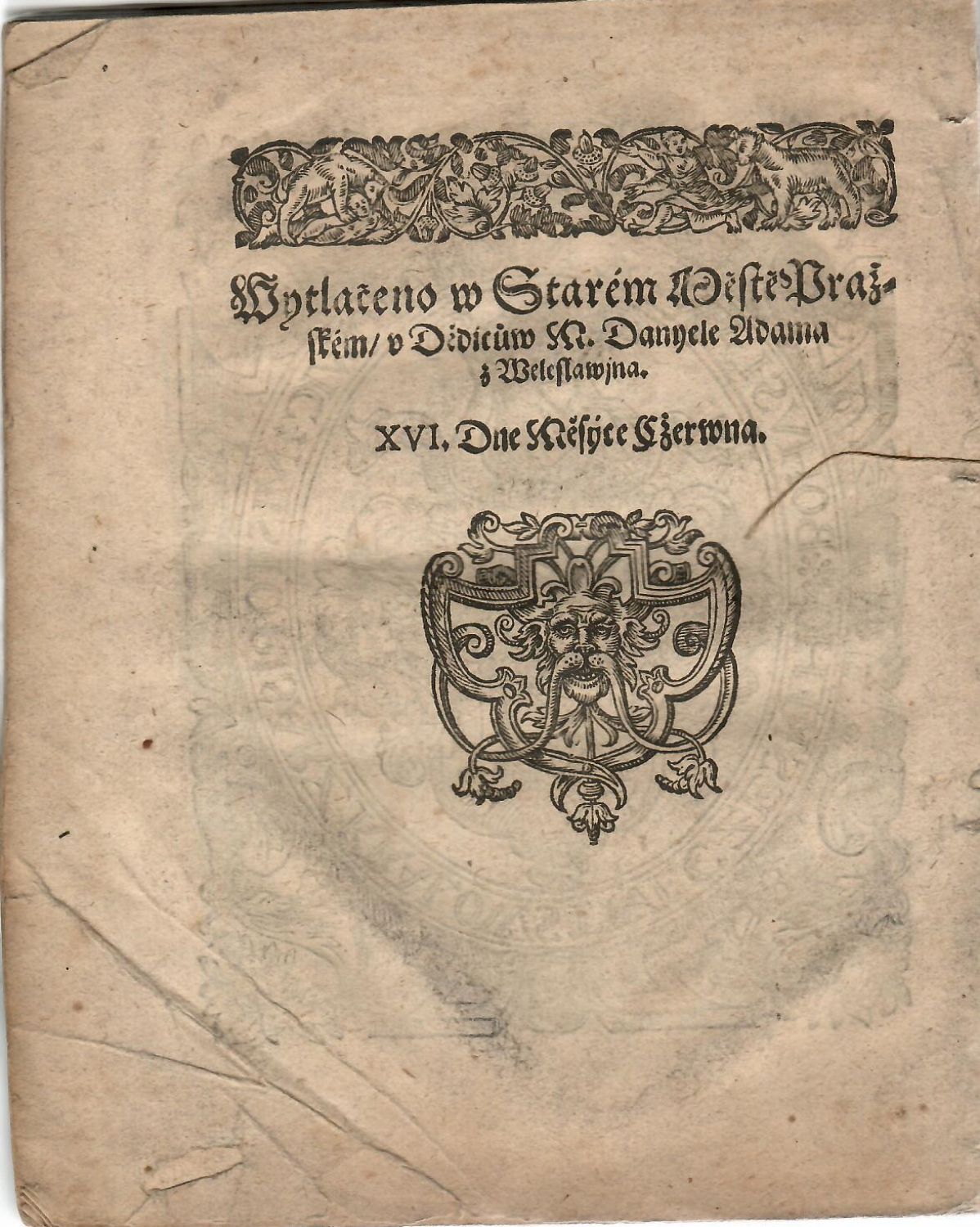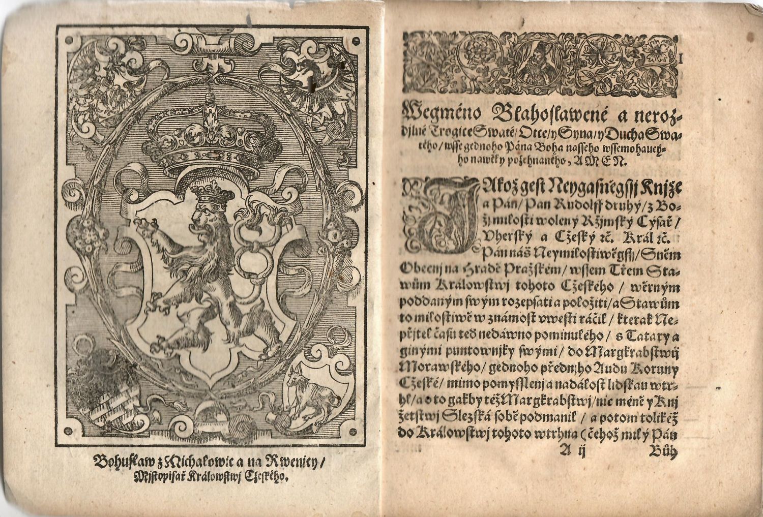 Knihopis 357; Jungmann IV,1054b.<br>Gotika, signatury, stránkové kustody, římská paginace stran při vnějším horním okraji. Na tit. listu dřevořez ve dvojitém rámečku (78 x 65 mm) s vyobrazením císařského znaku Rudolfa II., na jeho rubu v tučně tištěném jednoduchém rámečku do dřeva řezaný znak Království českého (152 x 112 mm), na straně I v záhlaví pásový vlys rostlinného dekoru v jehož středu je zakomponovaný oválný medailon s vyobrazením Rudolfa II., na rubu předposledního potištěného listu dřevořez s erbem Jana z Klenového a Janovic (140 x 110 mm), na líci posledního listu erb Bohuslava z Michalovic (140 x 110 mm). Vstupní iniciála na rostlinném pozadí ve výši 5 řádků, rejstřík na rubu strany LVII mezi florální lištou a maureskovou vinětou, impresum na konci mezi pásovým rostlinným vlysem, do kterého jsou zakomponovaná zvířata napadající lidi, a vinětou s hlavou fauna. - Poslední list při spodním vnějším okraji proděravělý a pomačkaný, titulní list při horním vnitřním okraji v názvu na dvou místech proděravělý od červotoče, oslí uši. Na tit. listu staré nečitelné rozmazané a vybledlé razítko.