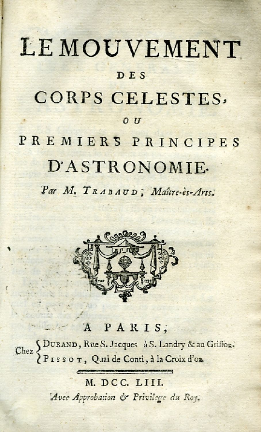 Na tit. listu viněta, ozdobná tyč z ornamentů a pásový vlys ve dvojitém jednoduchém rámečku s květinovým dekorem, versálkami tištěná živá záhlaví, místy tisk kursivou, na str. 339-366 tištěné tabulky Za textem šest rozkládacích mědiryt. příloh se 44 vyobrazeními dráhy měsíce, planet a astronomickými výpočty.<br>Dobová vazba ze světlé teletiny, na obou deskách rámeček z jednoduchých zlacených linek, v jeho rozích tlačené a zlacené ornamenty, ve hřbetu 5 vazů, ve druhém poli tlačený a zlacený název, v polích ostatních mezi dvojitými linkami tlačený a zlacený ornament, na předsádkách dobový tragantový papír, červeně barvené ořízky. Vazba mírně popraskaná a ohmataná, na předním přídeští vydřený kousek papíru, přední vakáty zašpiněné.<br>Jean Francois Trabaud byl francouzský fysik a matematik, který žil v 18. století. Ve svých dílech se věnoval kritickému zkoumání konceptu setrvačnosti a jeho budoucnosti, vnímal shodu mezi pohybem samotným a rovnováhou, vesmír je kombinací pohybu a hmoty a proto většina vědních disciplín (především astronomie a navigace)je vědou pohybu, či její součástí stejně jako mechanika.