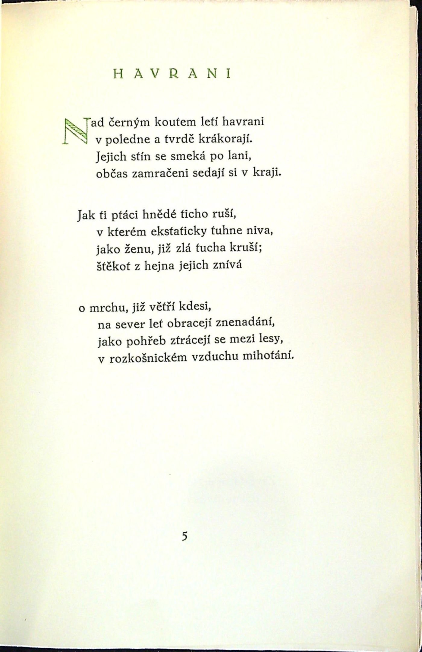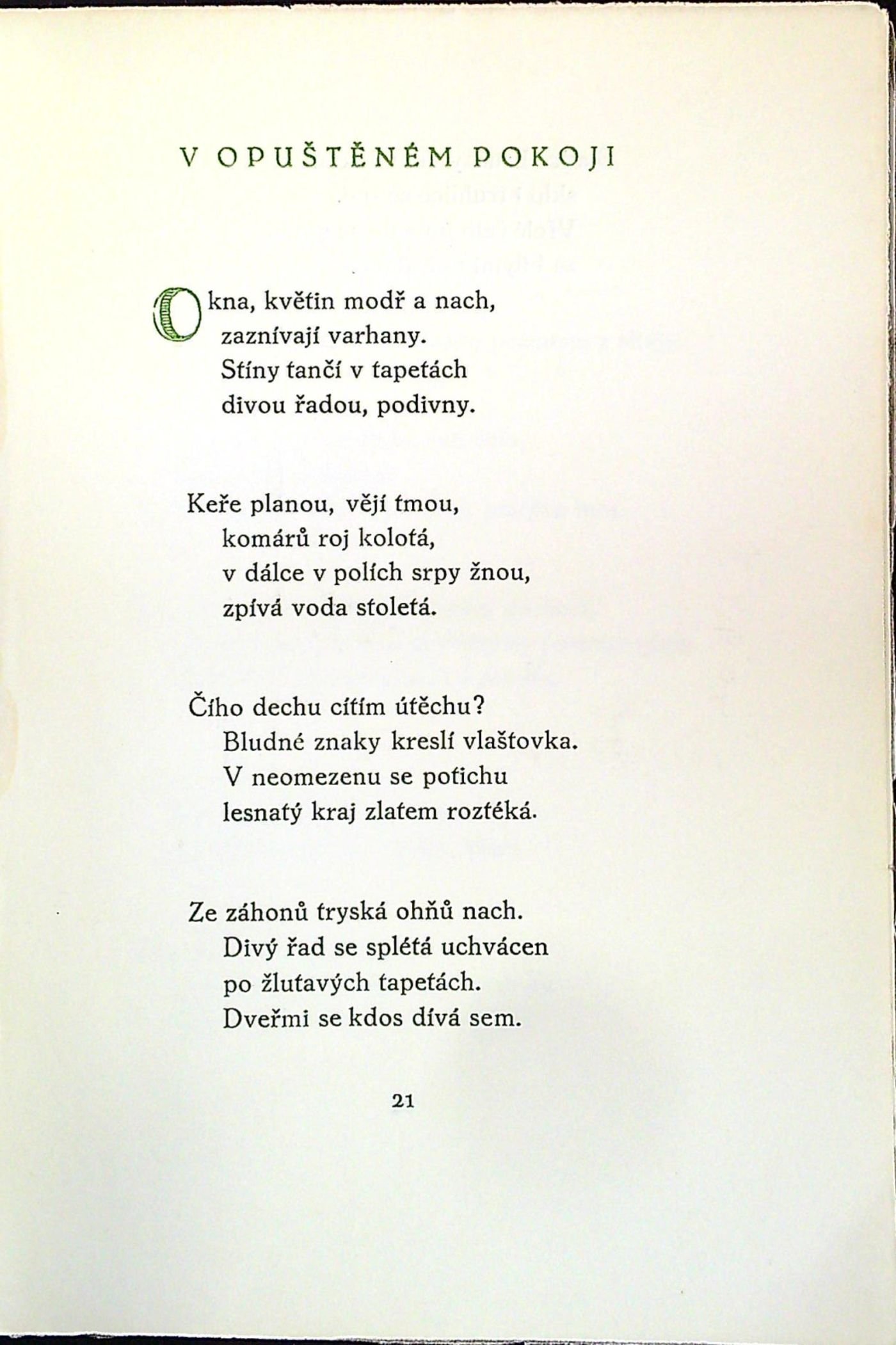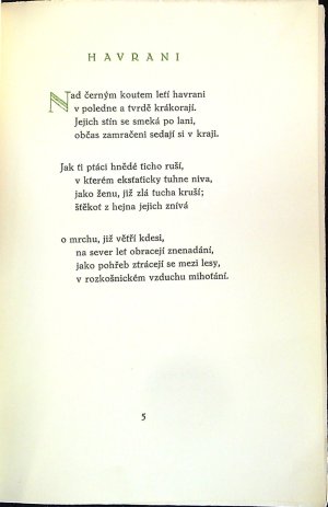 Jeden ze 350 vydaných a nečíslovaných exemplářů (krom toho bylo vydáno 50 výtisků na ručním papíře). Dvoubarevně tištěný titulní list, zeleně tištěné názvy jednotlivých básní a iniciály zalomené do výše 2 řádků. Knihu upravil Josef Marek a vyzdobil vinětou na tit. listu, přeložil Bohuslav Reynek a vytiskl František Obzina ve Vyškově. - Původní pap. obálka, na přední straně při vnějším okraji pomačkaný papír, na zadní straně při vnějším okraji v šíři cca 1 cm natržená, při spodním okraji hřbetu mírně natržený papír, knižní blok neoříznutý.