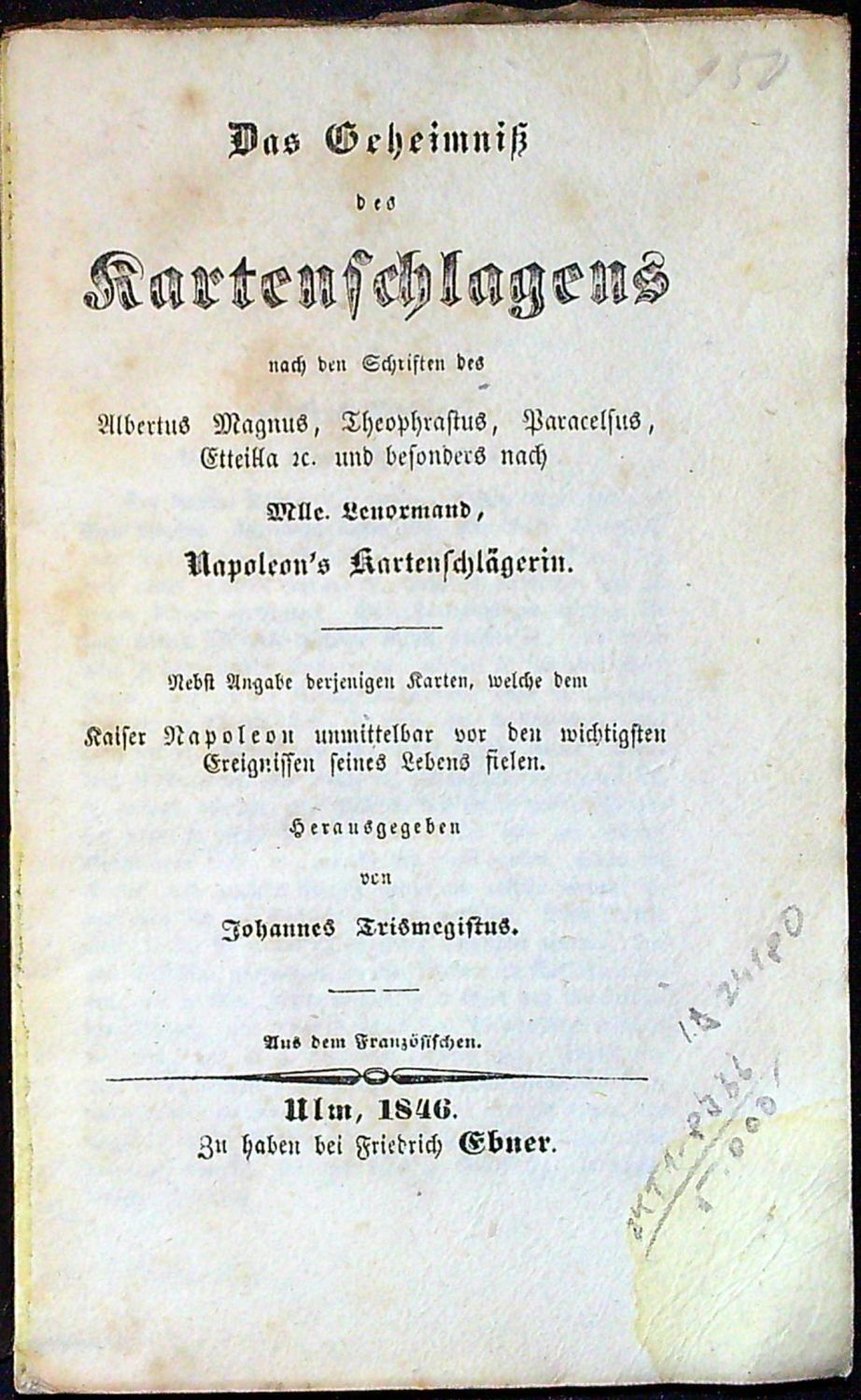 Das Geheimniß des Kartenschlagens nach den Schriften des Albertus Magnus, Theophrastus, Paracelsus, Eteilla etc. und besonders nach Mlle. Lenormand, Napoleon´s Kartenschlägerin. Nebst Angabe derjenigen Karten, welche dem Kaiser Napoleon unmittelbar vor den wichtigsten Ereignissen seines Lebens sielen. Herausgegeben von Johannes Trismegistus. Aus dem Französischen.