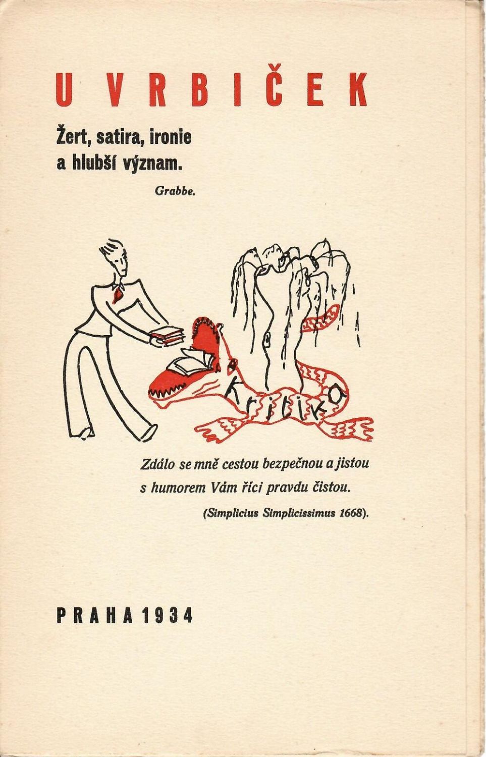 Edice "Satirikon", sv II. S příspěvky J. Bednáře, J. Čarka. O. Fischera, F. Halase, A. Hoffmeistra, J. Hory, J. Hořejšího, Z. Kalisty, J. Mahena, S. K. Neumanna, J. Seiferta, V. Vančury aj. Graf. úprava Alois Chvála, tisk Stiebling a Havelka v celk. počtu 220 výt. - Ex. č. 5/200 na dřevaprostém papíru.