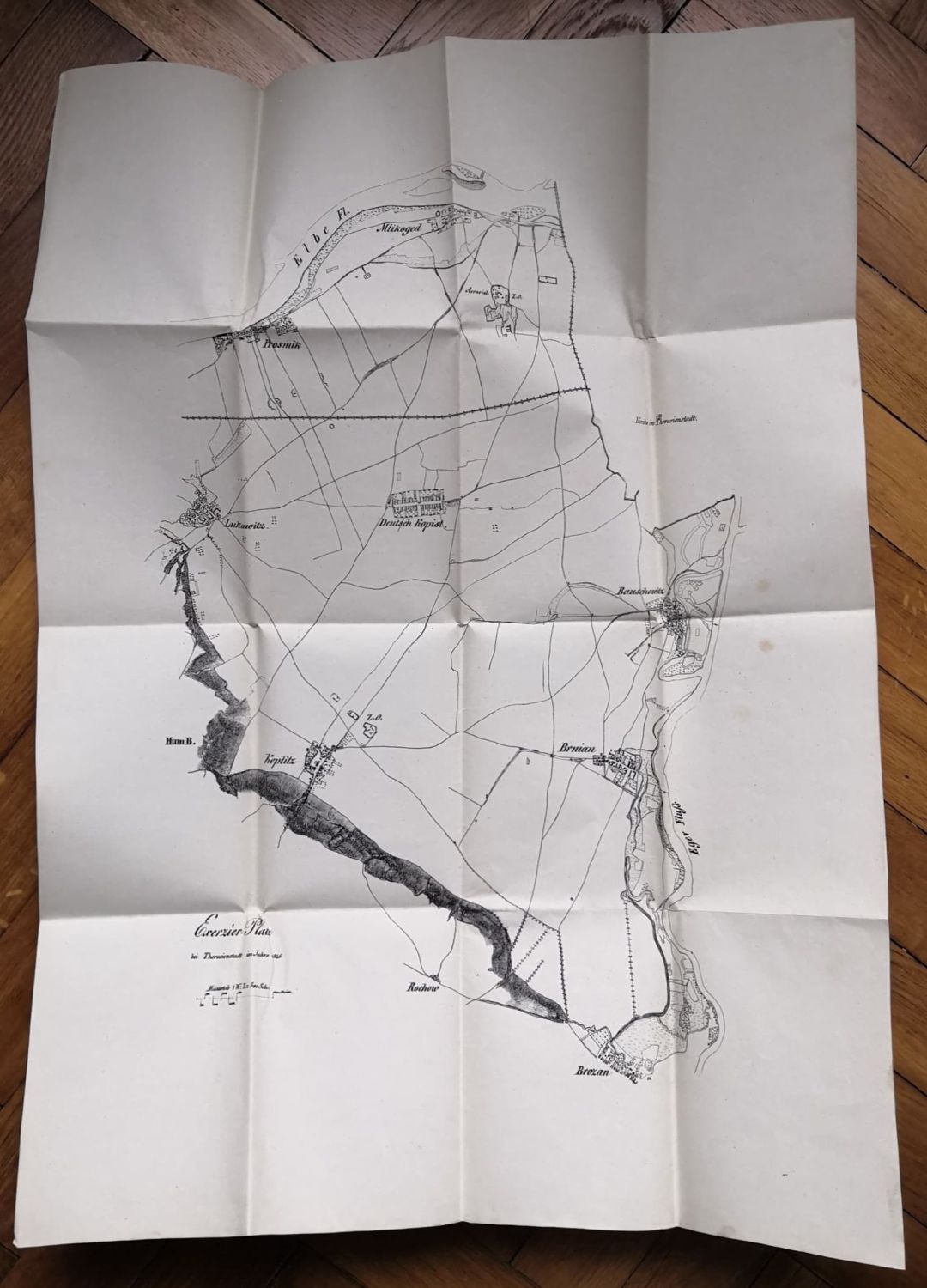 2) "Taktisches Corps Manoeuvre" (455 x 285 mm), "Uibersichts-Karte des Manoeuvre-Terrain im Jahre 1846" (440 x 280 mm), "Ordre de Bataille der bei Theresienstadt im Jahre 1846 vereinigten Truppen" (440 x 280 mm), "Ordre de Bataille während den Feld-Manoeuvres" (440 x 280 mm), "Kirchenparade" (230 x 280 mm), "Exezier Platz bei Theresienstadt im Jahre 1846" (740 x 540 mm), "Oleate zum taktischen Manoeuvre" (540 x 490 mm). 7 litografovaných rozkládacích plánů s texty.<br>