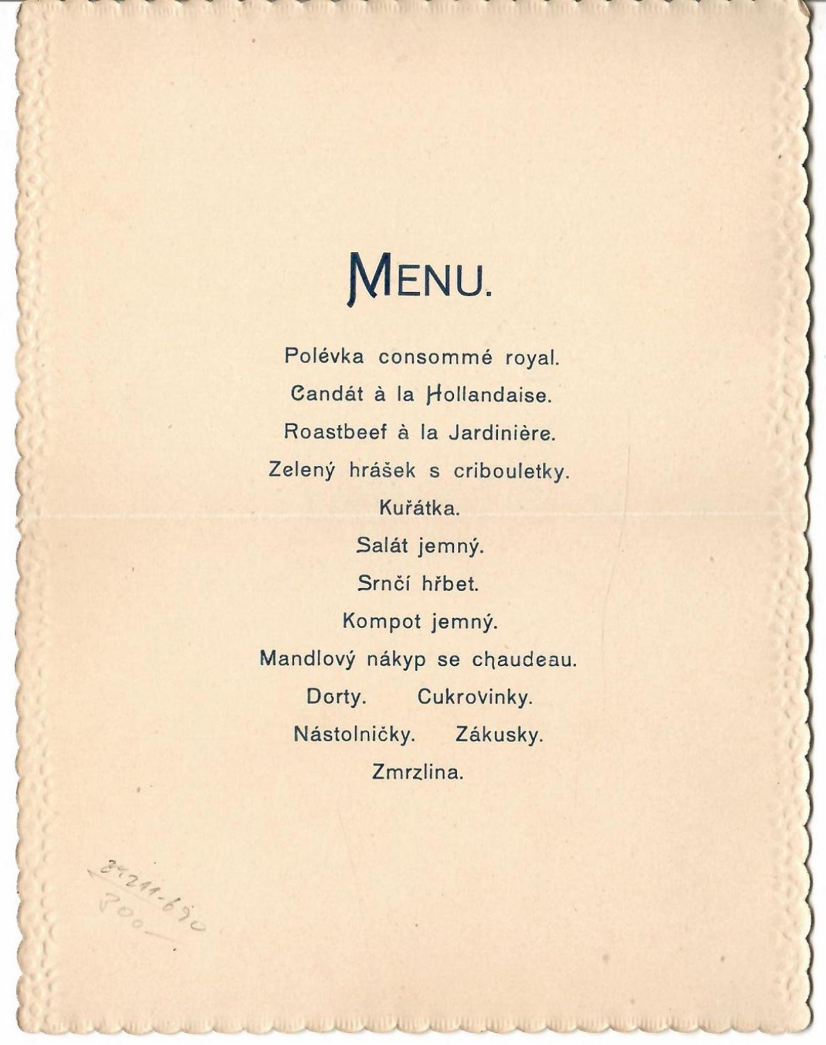 Uvnitř dvoulistu soupis jídel. Desky lehce ošoupány, na přední desce pár světlých flíčků.