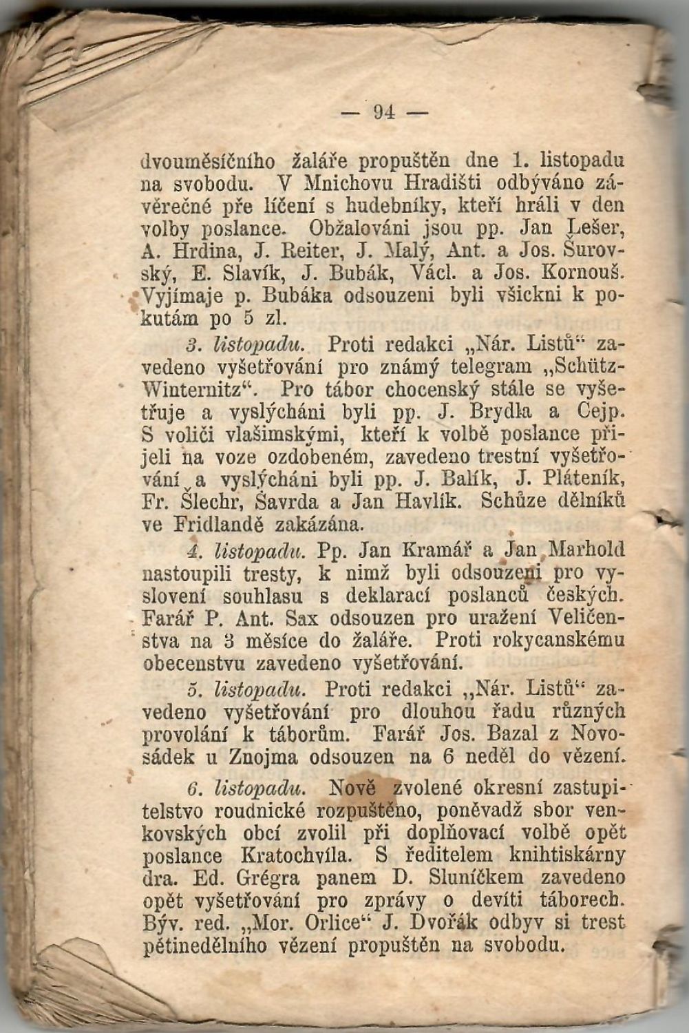 Tištěno švabachem, arabská paginace stran uprostřed horního okraje mezi krátkými pomlkami, mizící linky, na straně 47-50 tištěno ve dvou sloupcích, místy zvýrazněný tisk černí a velikostí písma. - Pravděpodobně chybí titulní list, na prvním listu při spodním vnějším okraji utržen kousek papíru.<br>+ přívazek: [Jakub Arbes]: "Pláč koruny české čili nová persekuce". Praha, 1870, nákladem vlastním, tiskem dra. Ed. Grégra, 96 stran (ze 100 str.). Tištěno antikvou, poslední dochovaná strana 95-96 je od knižního bloku odtržená, potrhaná a pomačkaná. - Arbesův pamflet anonymně publikovaný je jeho knižní prvotinou.