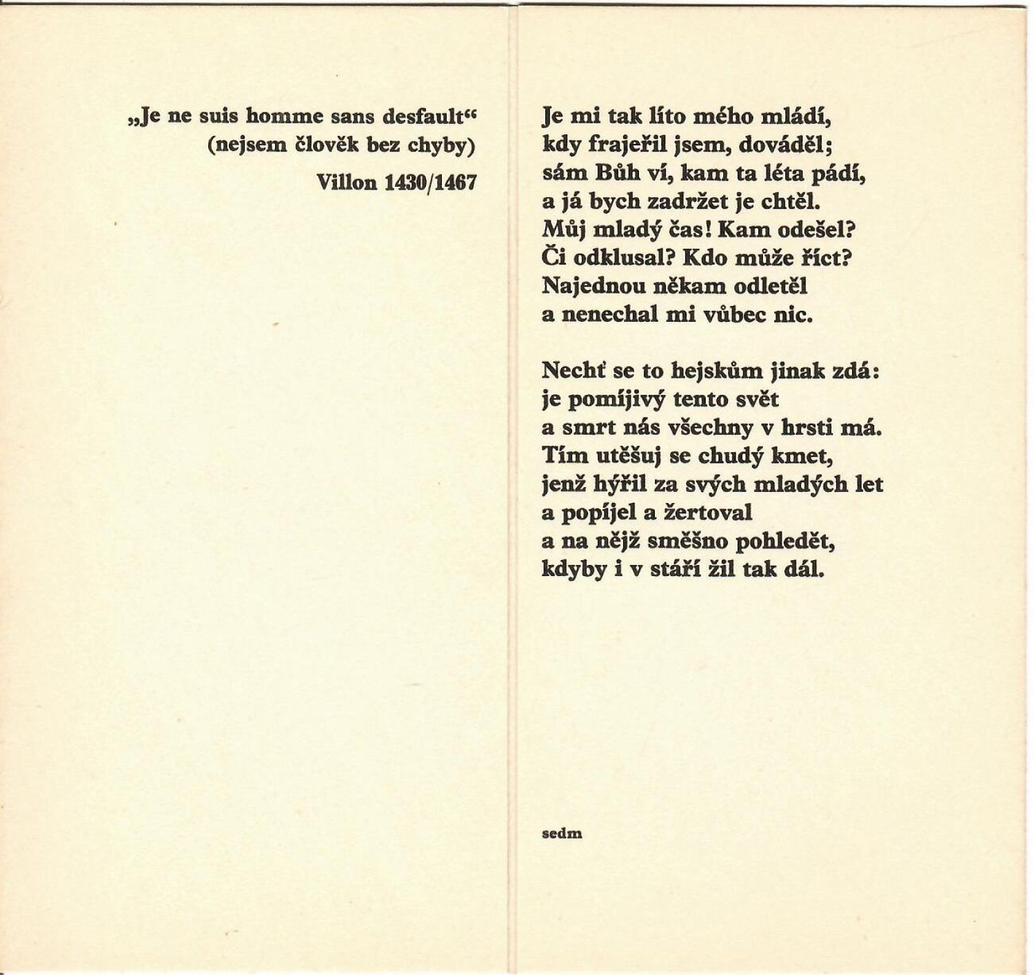 Ex. č. 19 z 200 vydaných, které typograficky upravil a na filtračním papíře z ruční sazby breviář Plantin tučný vytiskl Martin Dyrynk pro potěšení přátel jako soukromý bibelot k Novému roku 1977. V tiráži podpis perem Dyrynkův a u čísla tisku jeho iniciála. Původní pap. obálka, ve které jsou volně vloženy složené dvoulisty, tisk pouze po jedné straně složených listů.