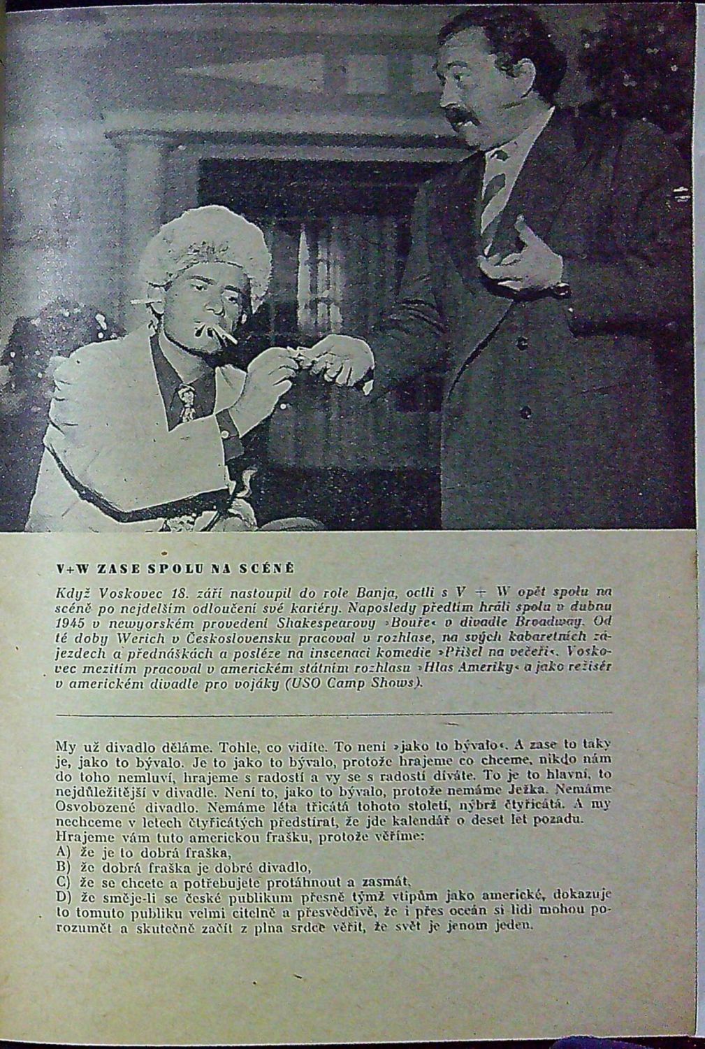 Na přední straně obálky fotografie V+W, v textu 15 fotograf. vyobrazení. V úvodu krásná vzpomínka Jiřího Voskovce na Jaroslava Ježka nazvaná "Nejkrásnější Ježkova píseň". Volně vložený program představení z listopadu 1946. Původní obálka na přední straně při spodním okraji lehce natržená (cca 0,5 cm).
